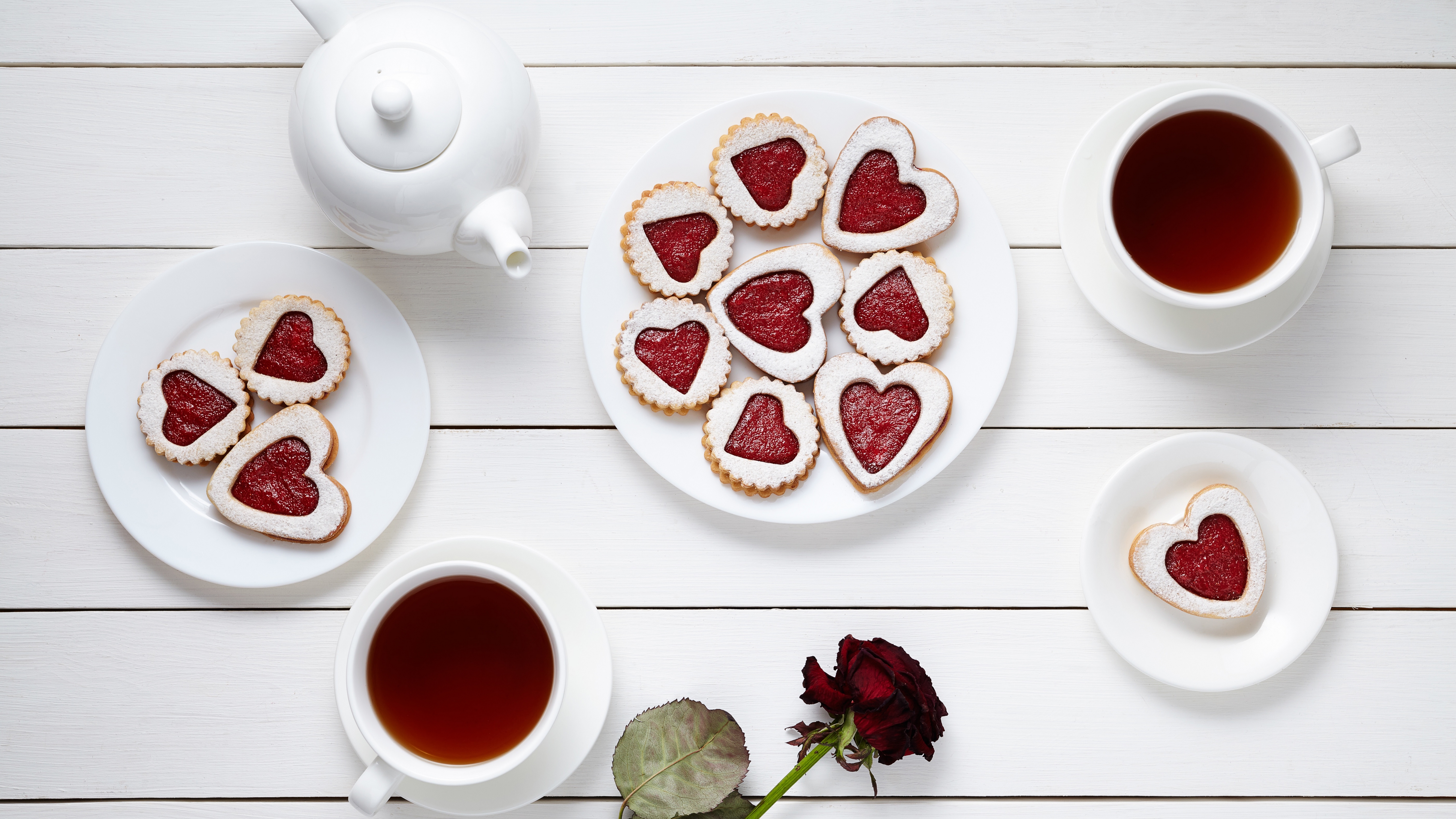 Description: A table topped with plates of heart shaped cookies next to cups of tea and a rose on a plate.