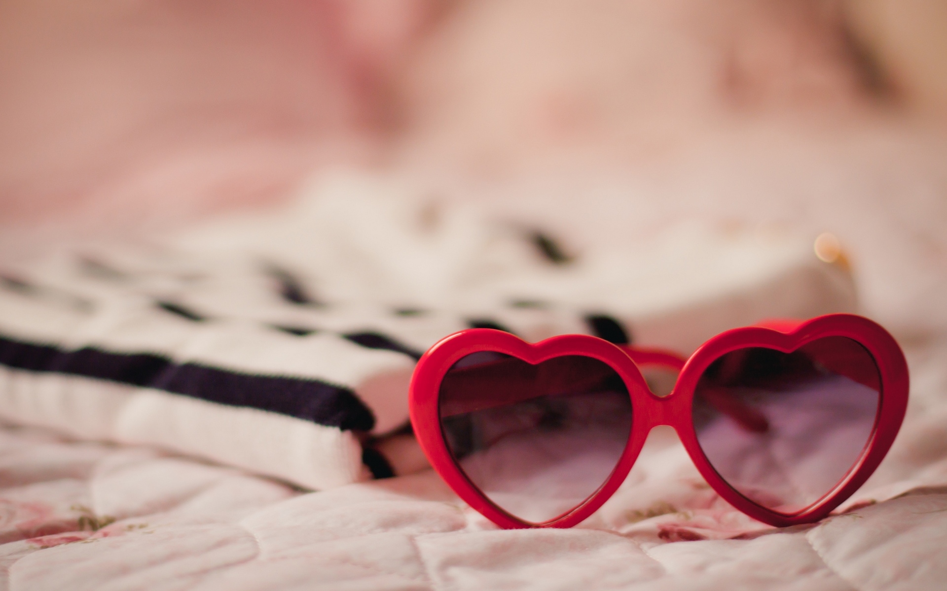 Description: A pair of heart shaped sunglasses laying on a bed with a blanket behind it and a book on the bed.