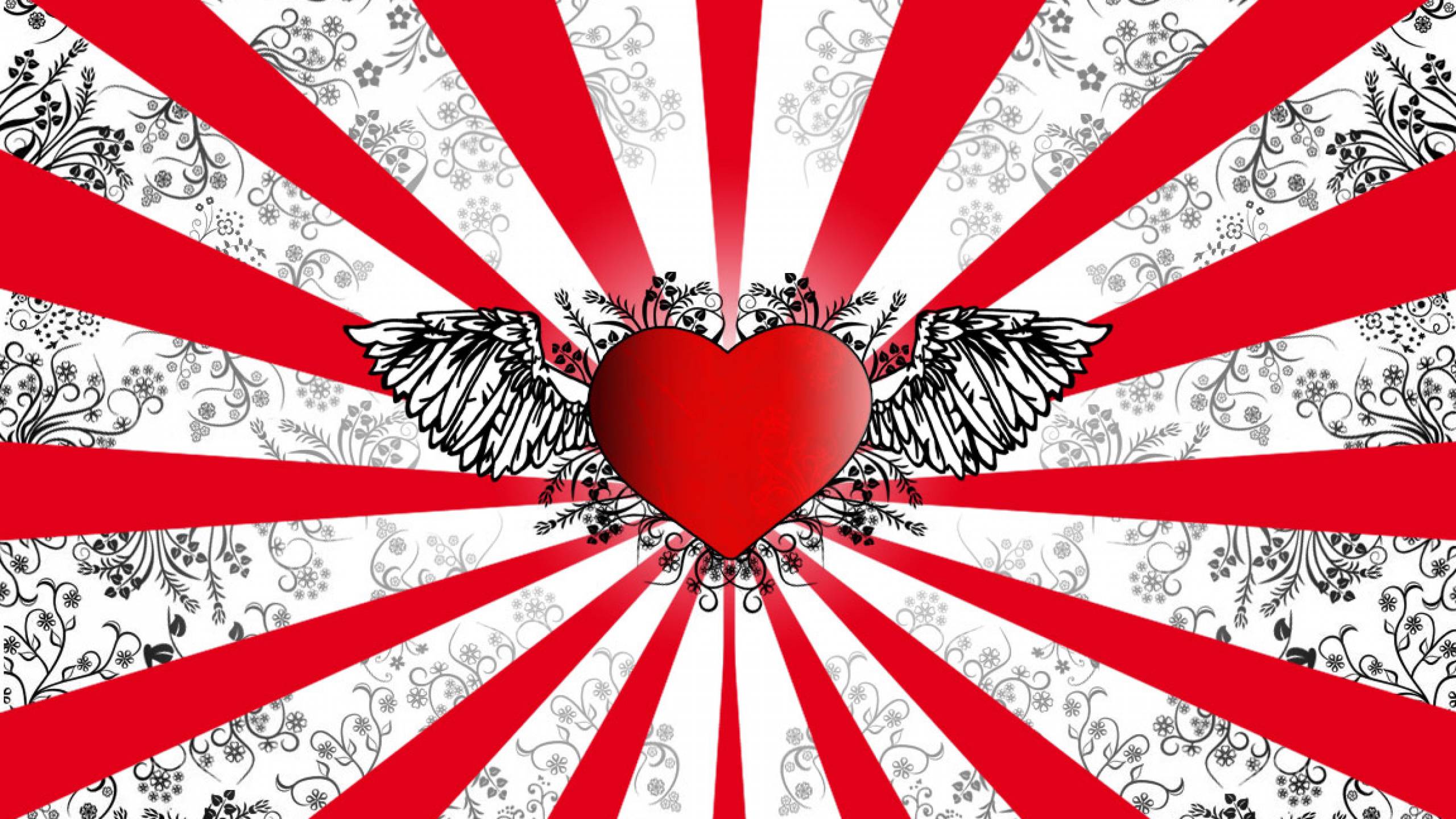Description: A heart with wings and a floral pattern on a red and white background with a red heart on the center.
