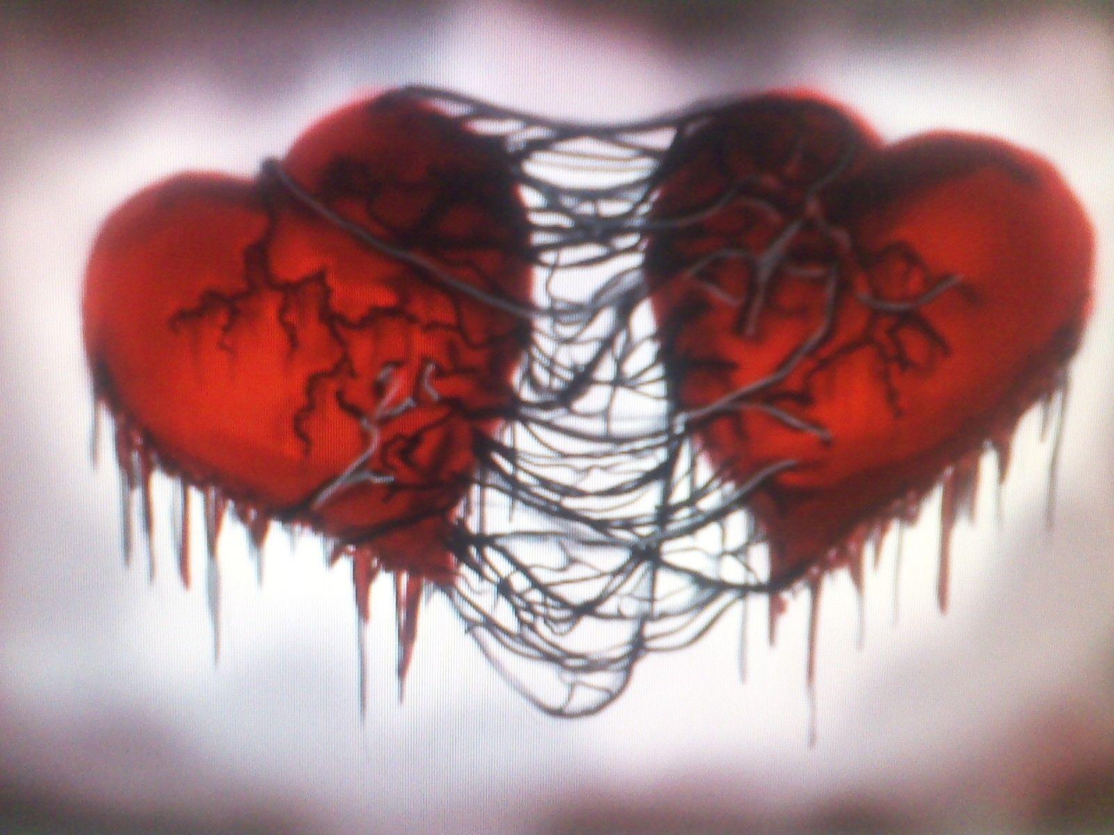 Description: A heart with a wire wrapped around it and dripping blood on the side of it.