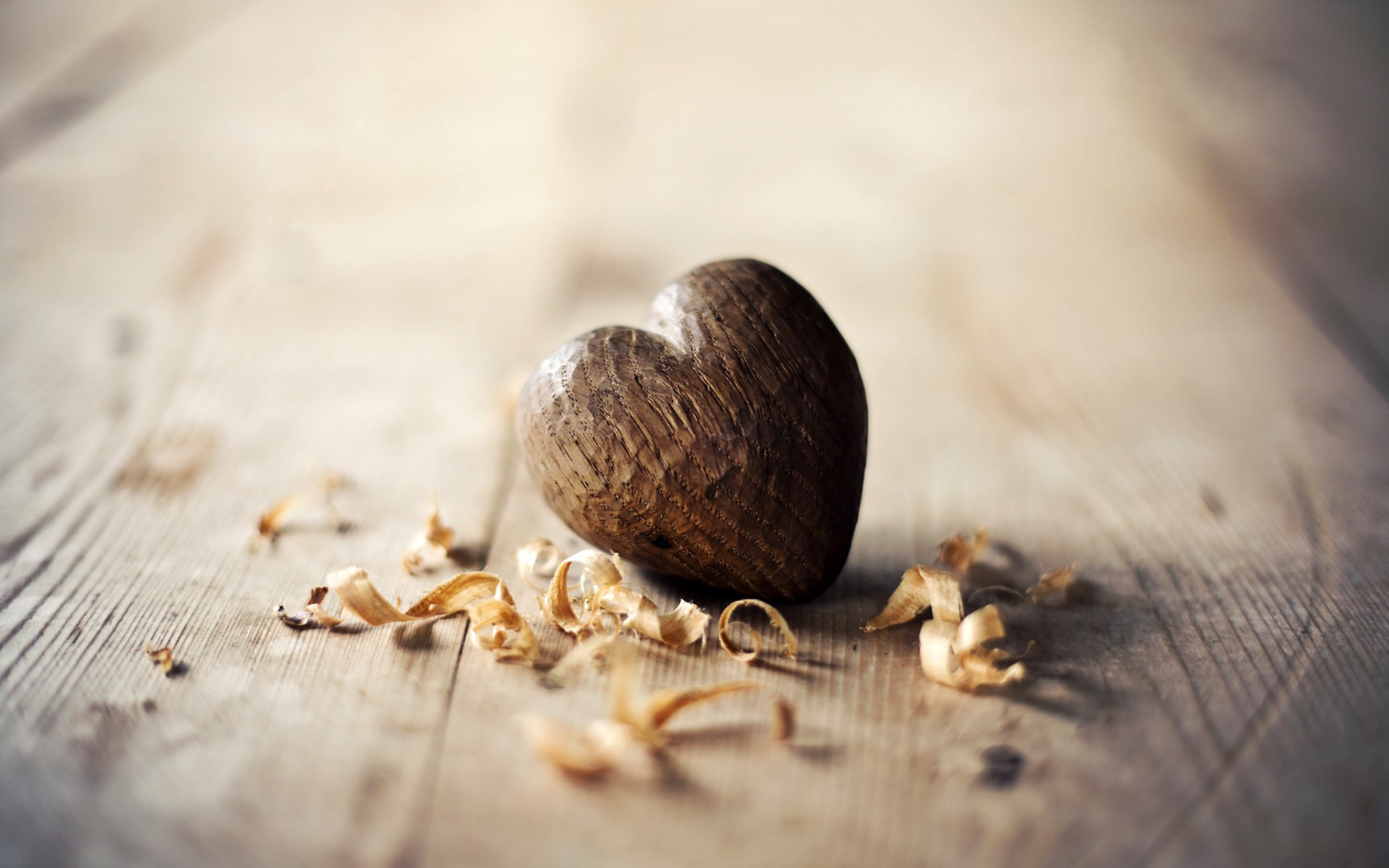 Description: A heart shaped wooden object on a wooden table with dried flowers around it and a few pieces of wood shaving.