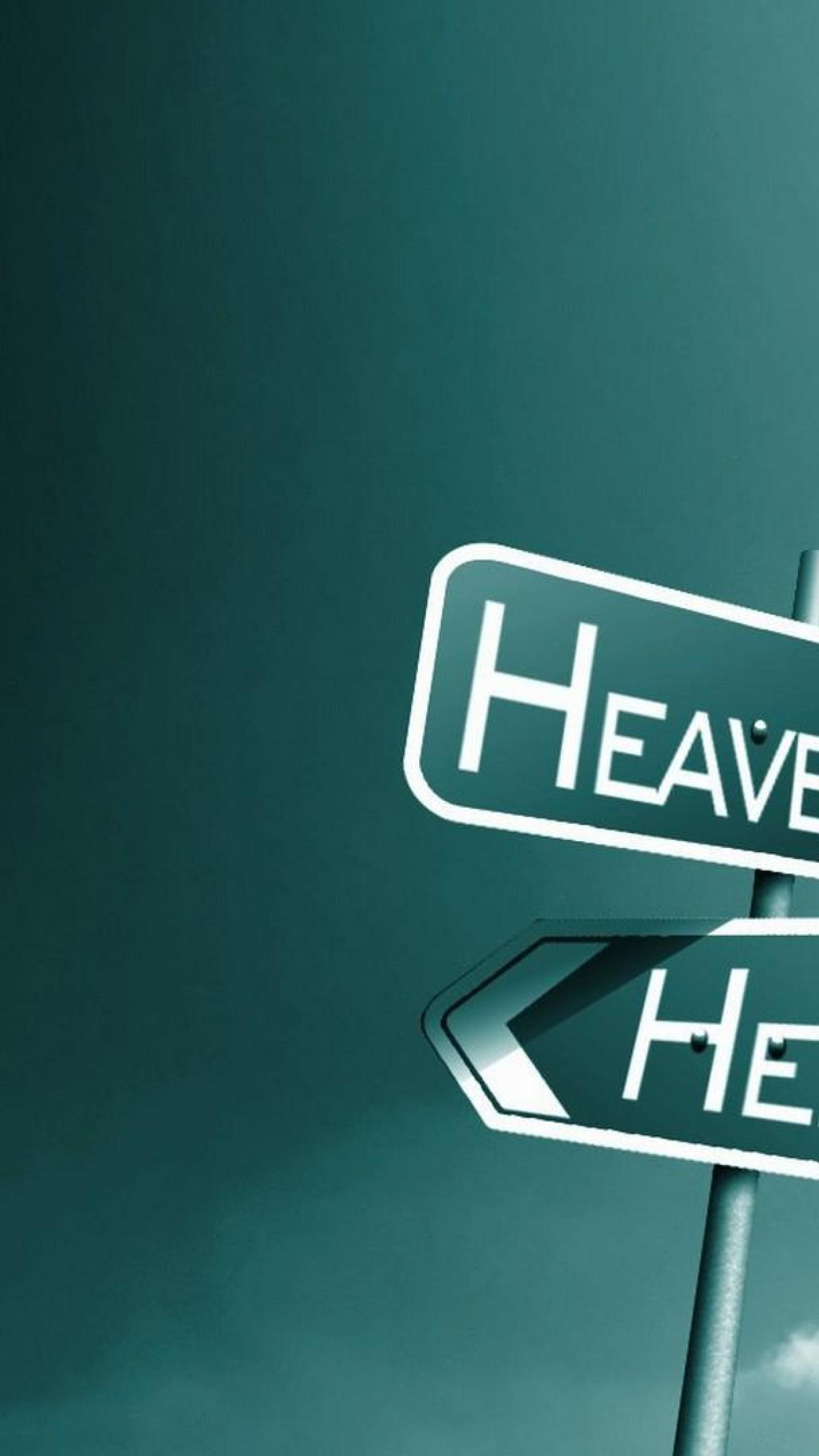 Description: A street sign with the words heaven and hell on it in front of a cloudy sky with clouds in the background.