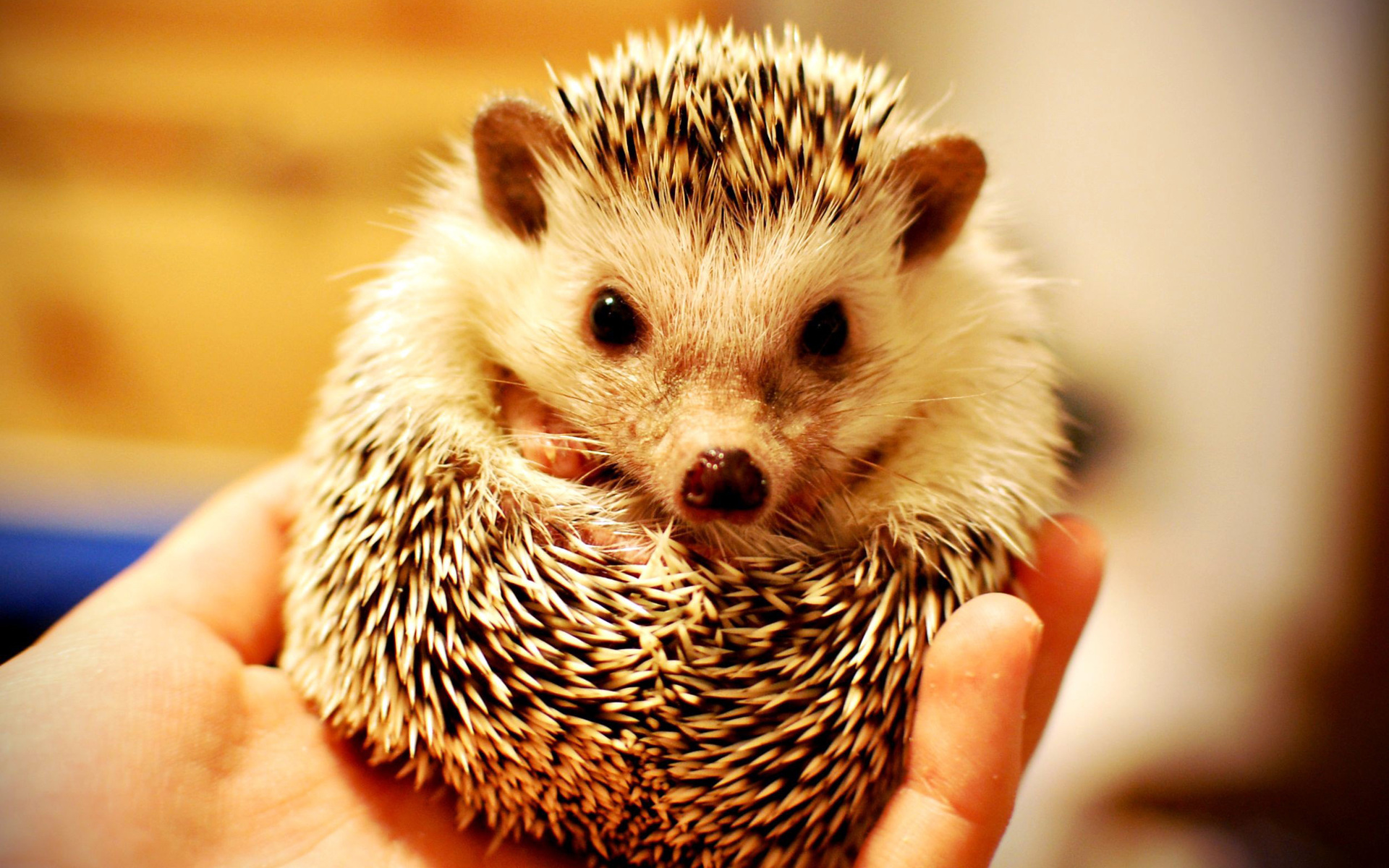 Description: A small hedge sitting in a persons hand next to a wall and a blue bowl of water in the background.