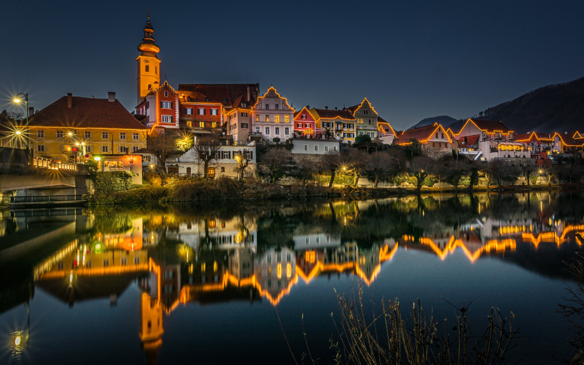 Description: A city with a lake and a clock tower in the background at night time with lights on the buildings.