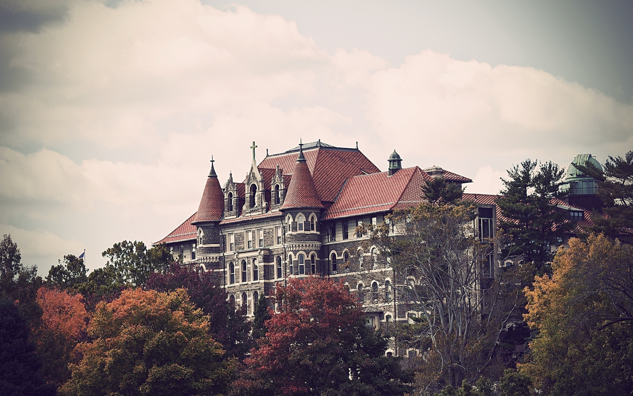 Description: A large building with a tower and a clock on top of it surrounded by trees and clouds in the background.