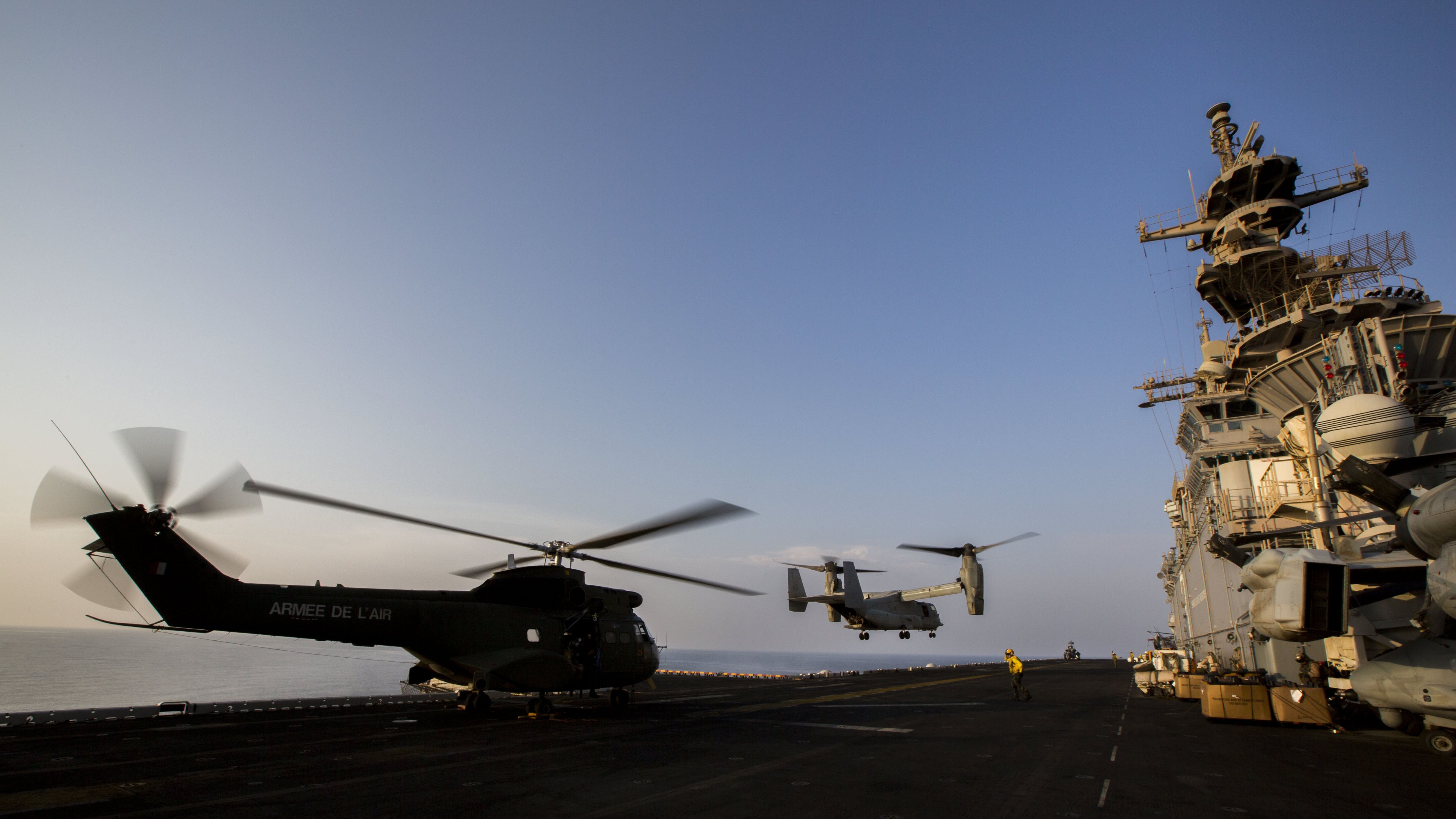 Description: A helicopter is flying next to a helicopter on a ship in the ocean with another helicopter in the background.