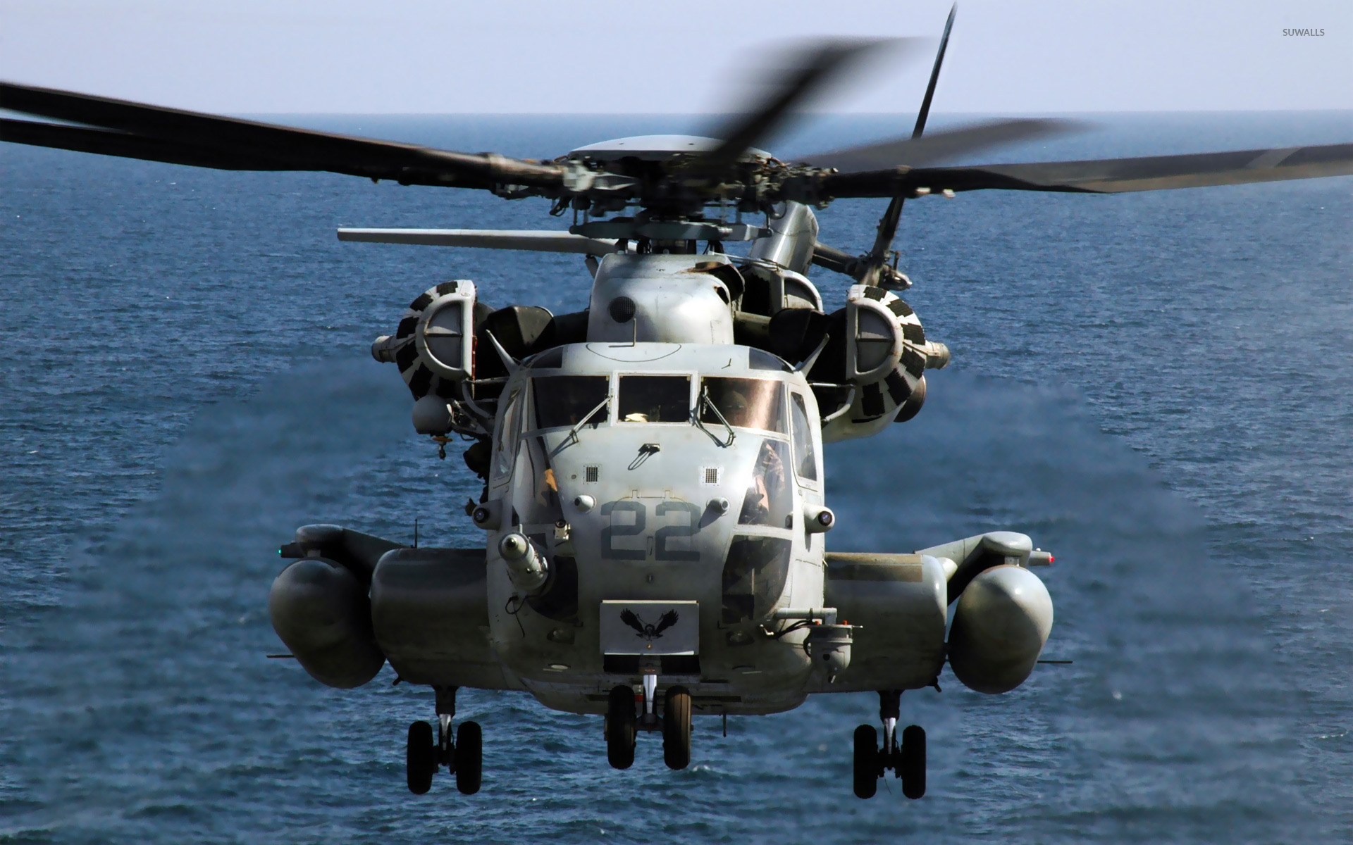 Description: A helicopter flying over the ocean with propellers on it's wings and a propeller on the front of the helicopter.
