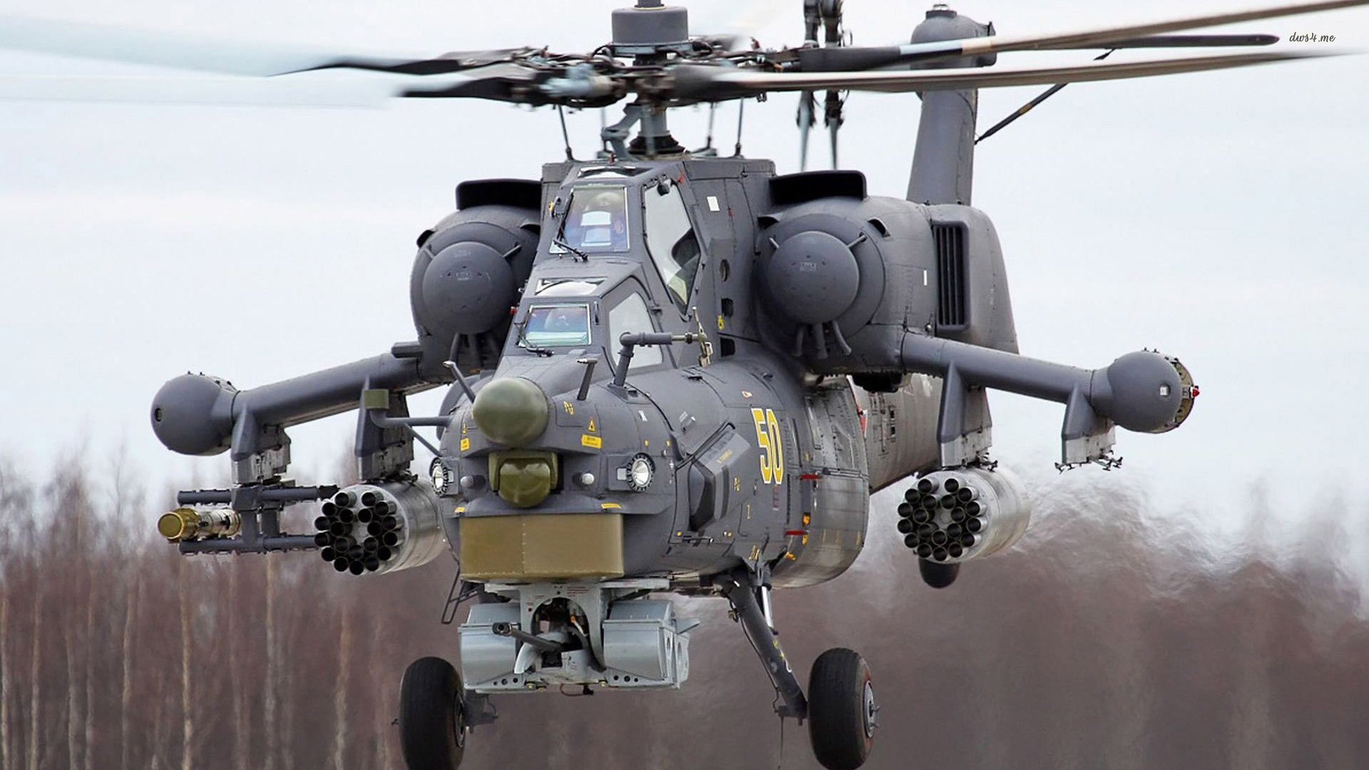 Description: A helicopter flying through the air with a sky background and trees in the background.