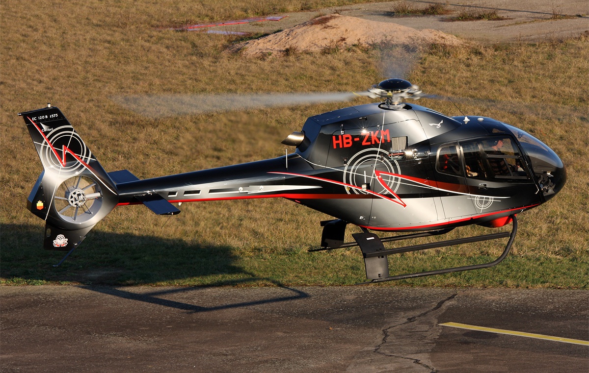 Description: A helicopter is parked on the ground in a field of grass and grass with a hose coming out of it.