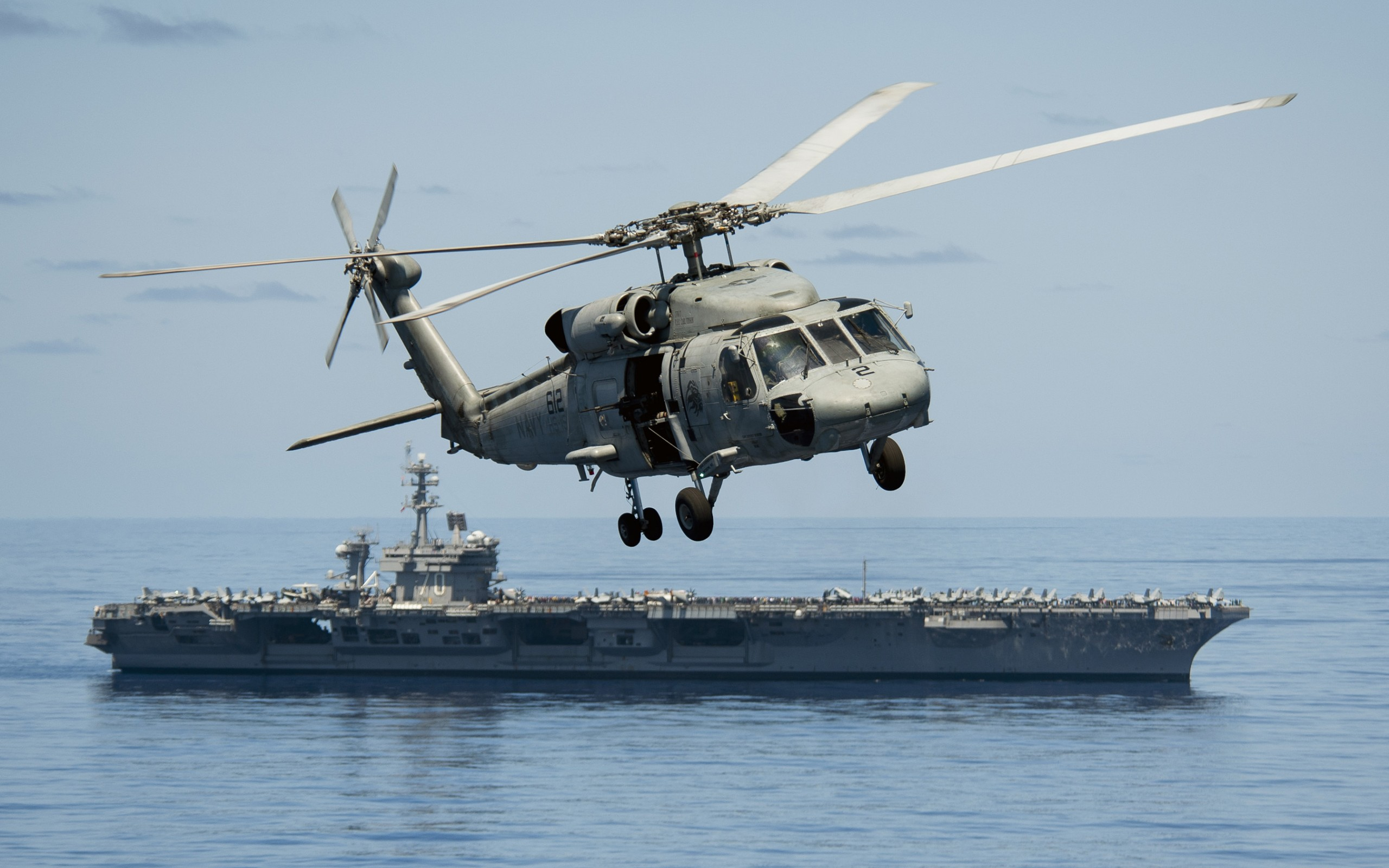 Description: A helicopter flying over a ship in the ocean with a helicopter on the water behind it and a smaller boat in the water.