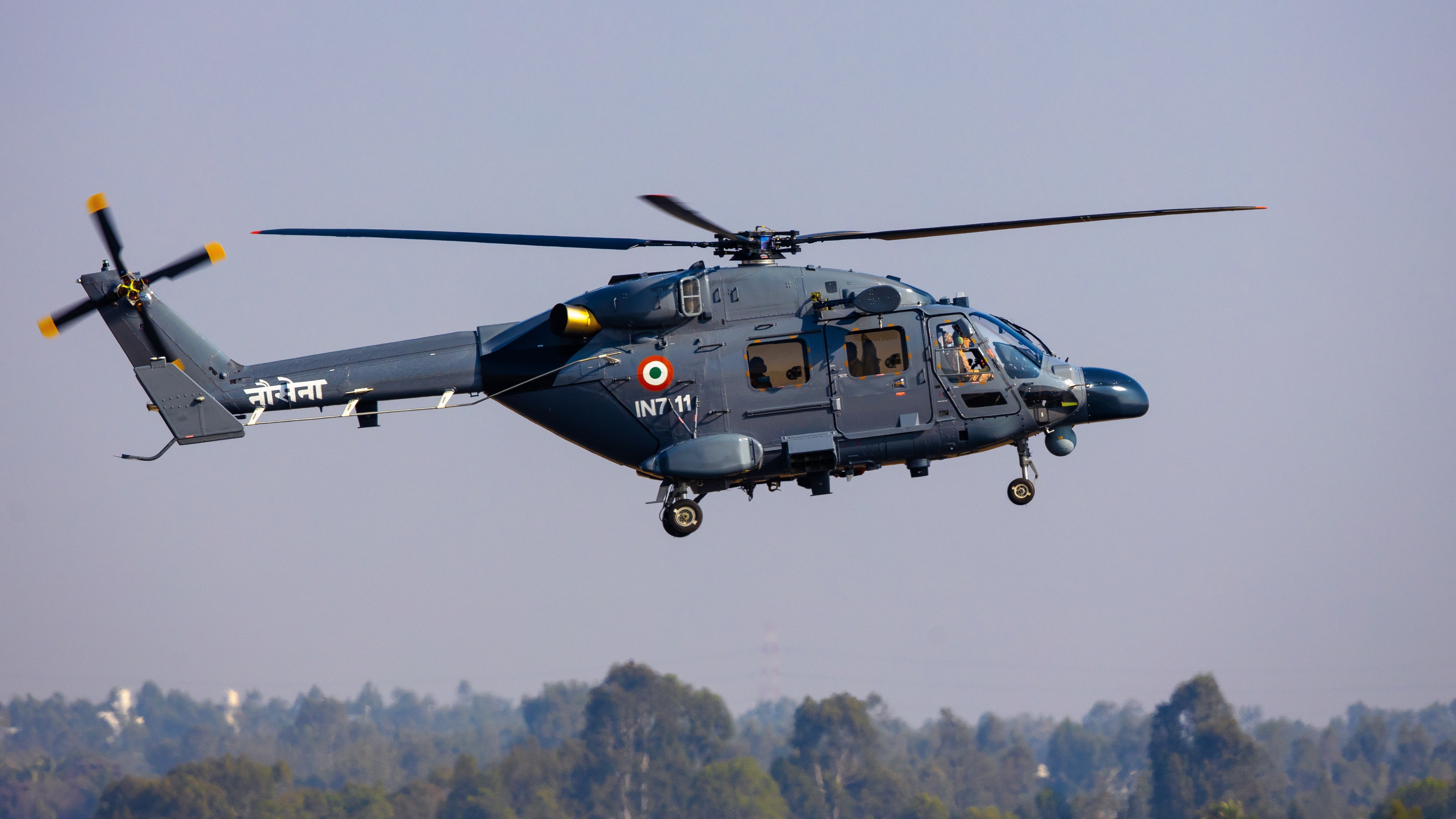 Description: A helicopter flying through the air with trees in the background and a sky background with a few clouds in the sky.
