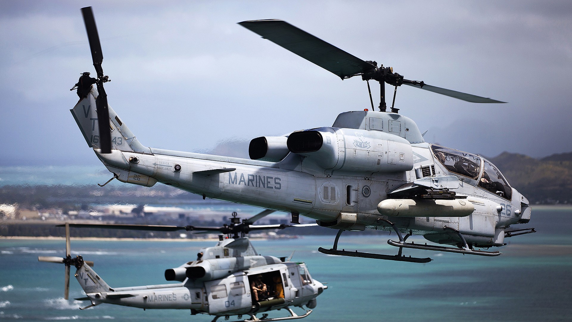 Description: Two military helicopters flying over a body of water with a city in the background and a mountain in the distance.