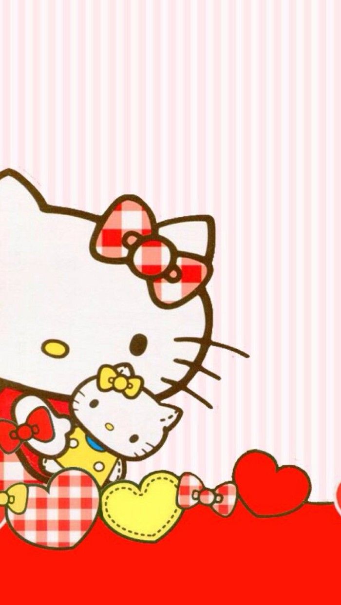 Description: A hello kitty wallpaper with a heart and a bow on it's head and a bow on its chest.