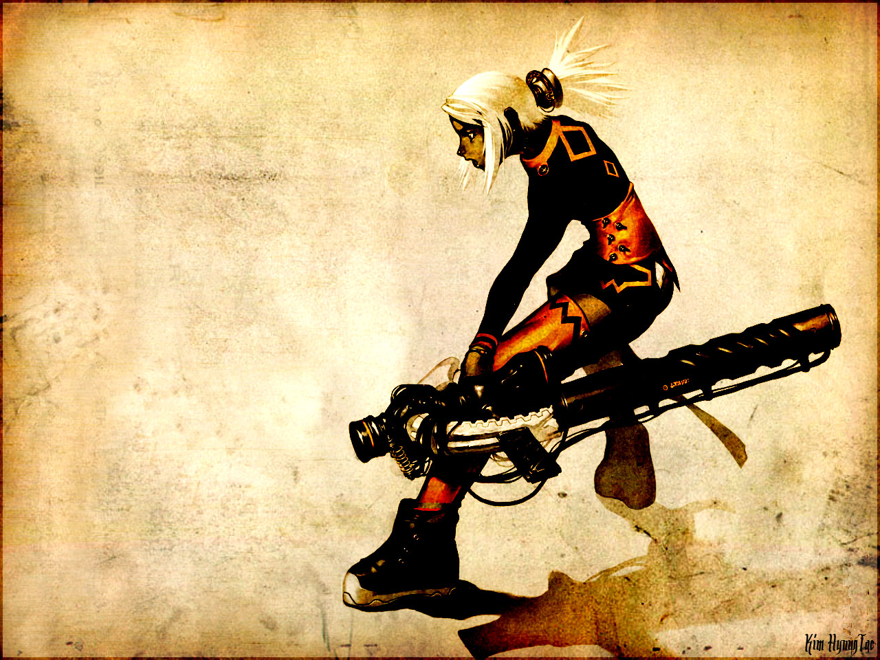 Description: A person with a gun and a helmet on a bike with a sky background and a grungy effect.