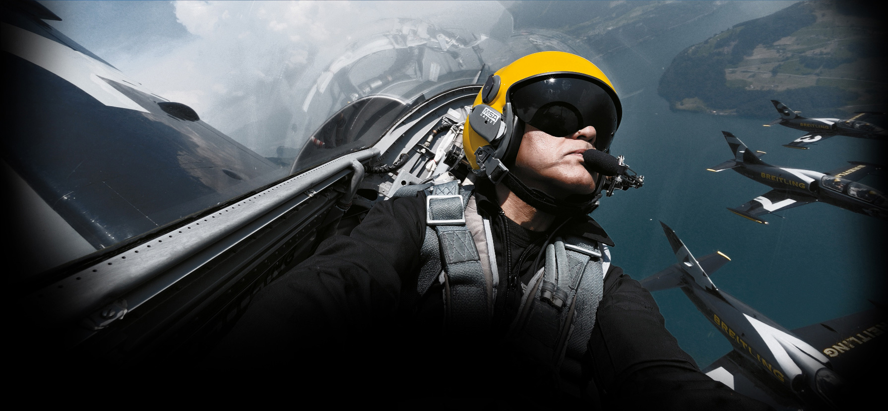 Description: A man in a helmet is flying in a plane with fighter jets in the background and a yellow helmet on.