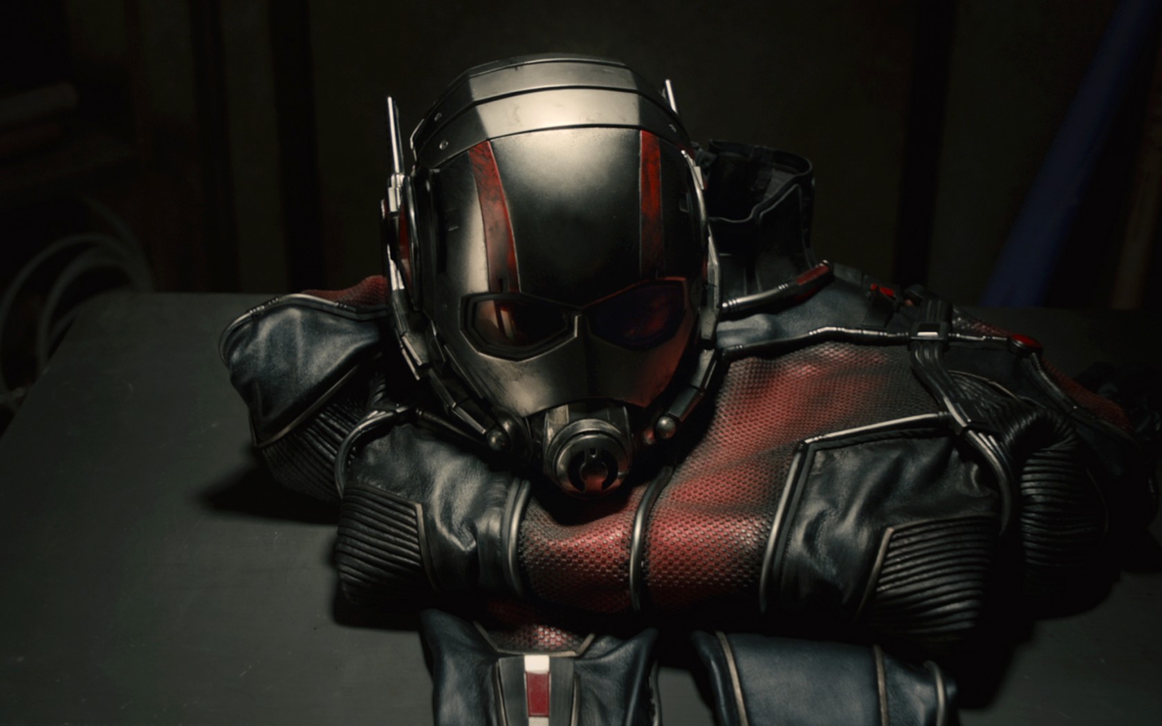 Description: A close up of a person wearing a helmet and gloves on a table with a black background and a black table.