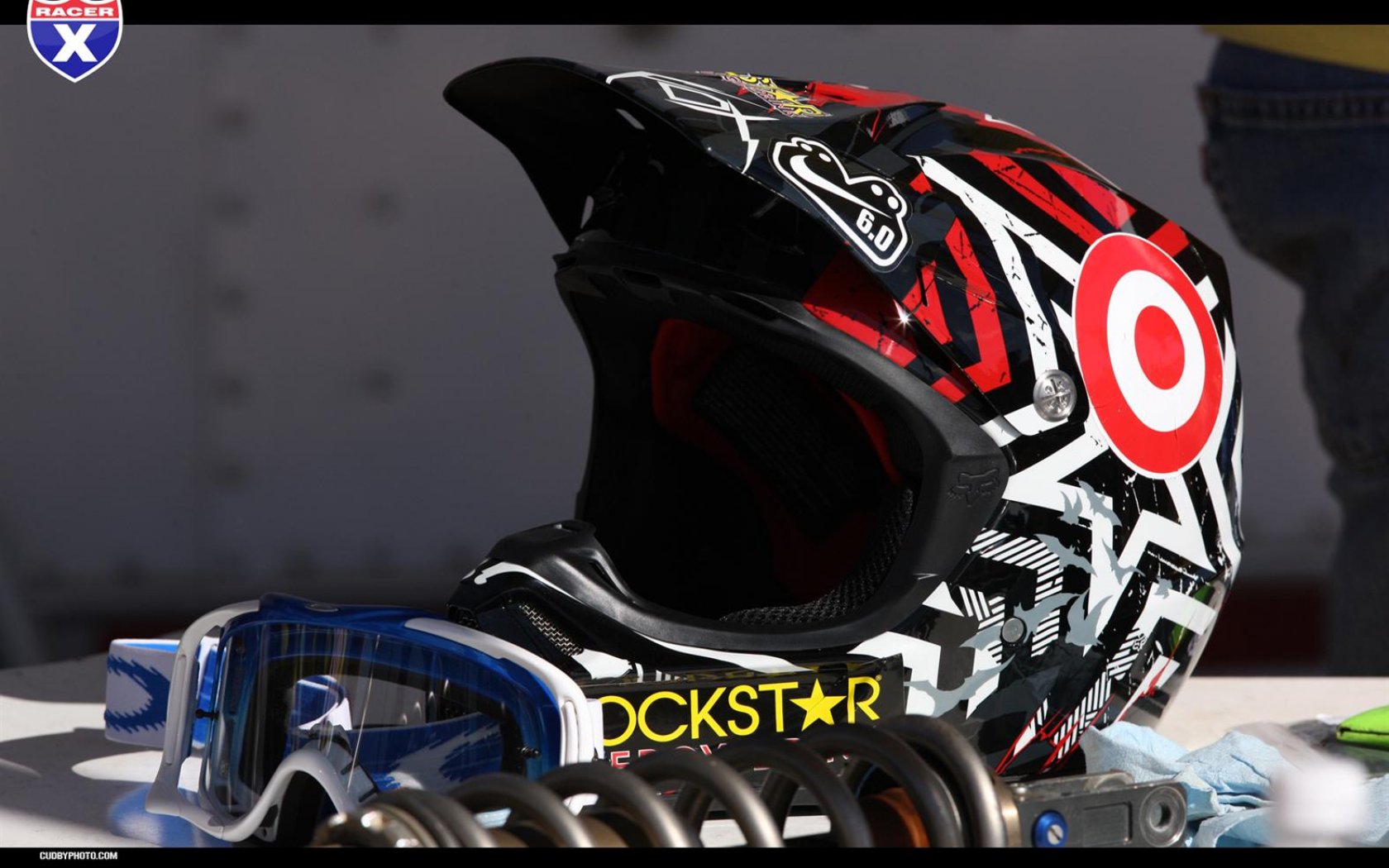 Description: A helmet and goggles are sitting on a table with other items on it and a person standing behind it.