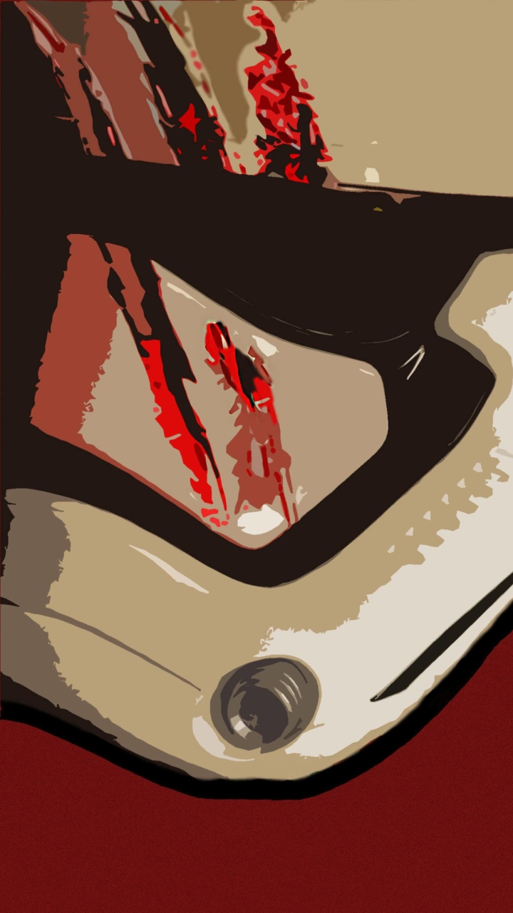 Description: A helmet with a red background and a red background with a red stripe on the bottom of the helmet.