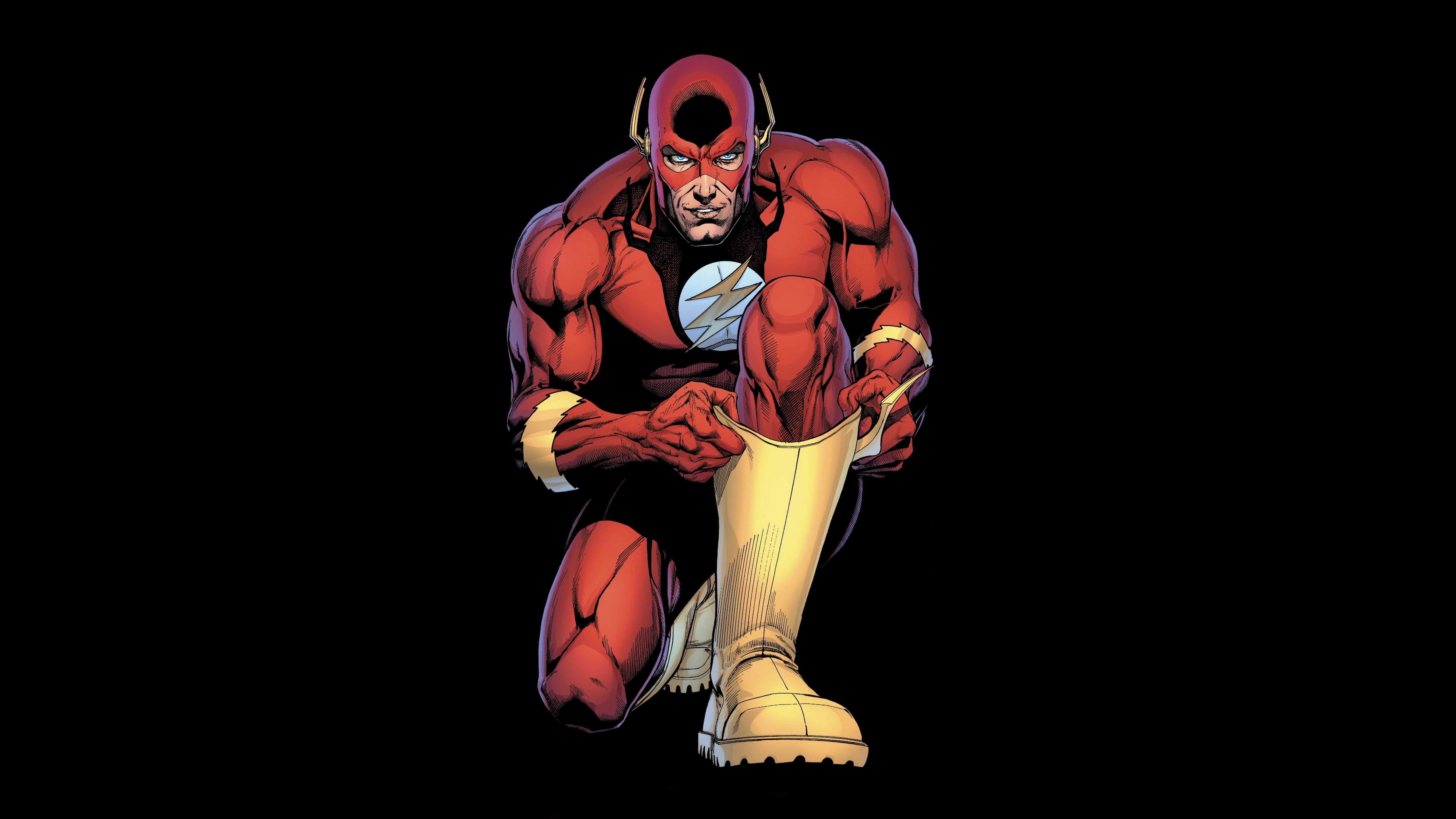 Description: A man in a red and yellow costume sitting on a yellow boot with his hands on his knees and his legs crossed.