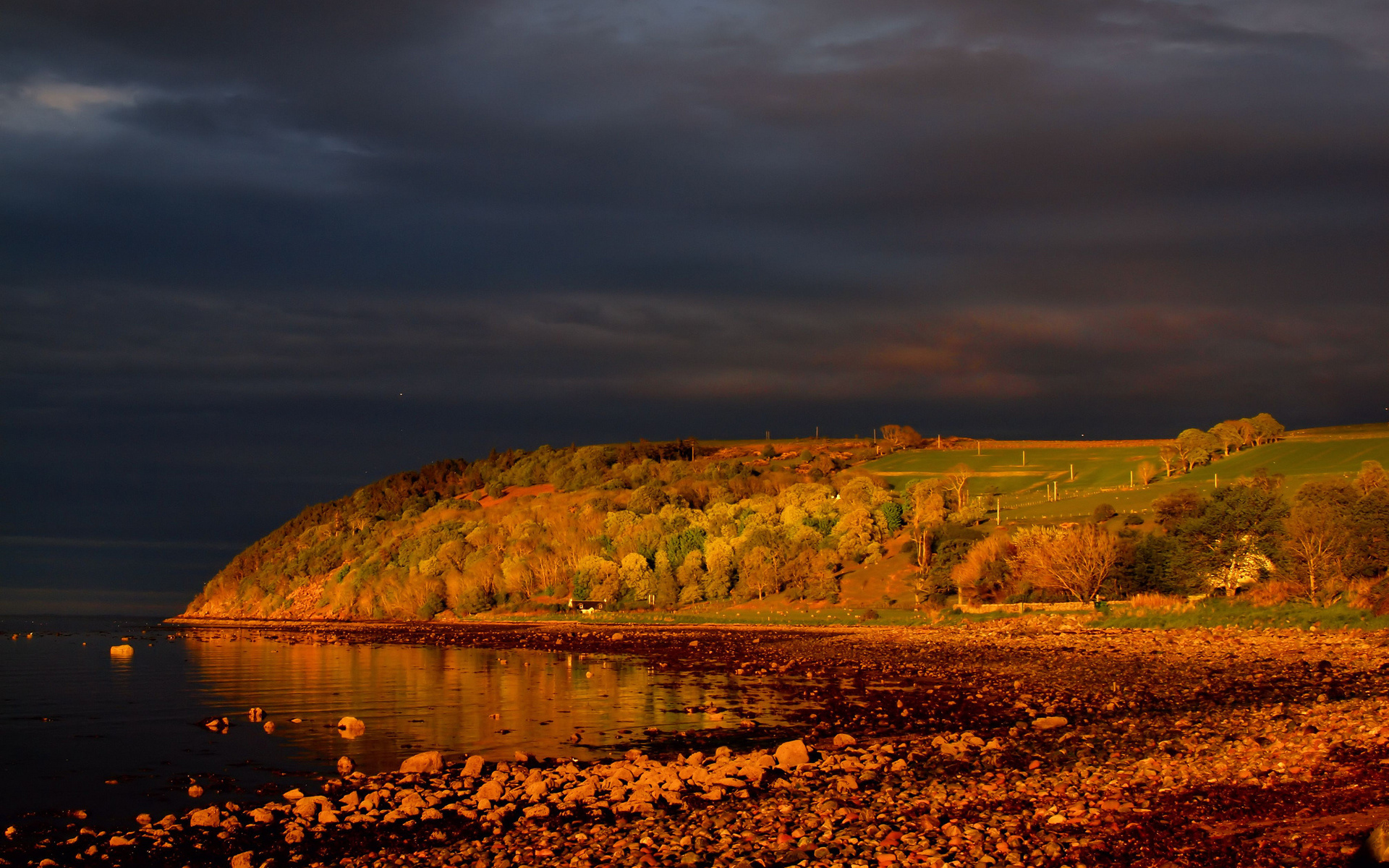 Description: A hill with a lake and a forest on the side of it under a cloudy sky with a few clouds.
