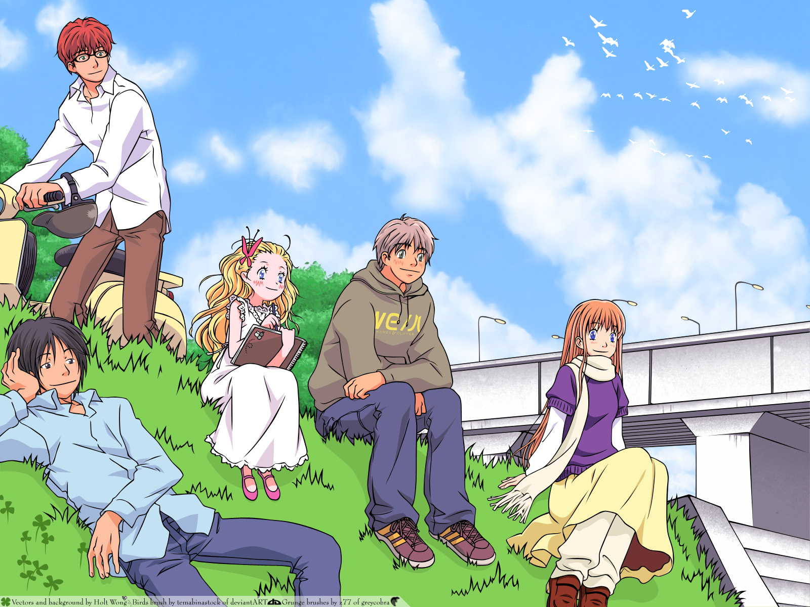 Description: A group of people sitting on a hill with a sky background and a bridge in the background with a sky background.