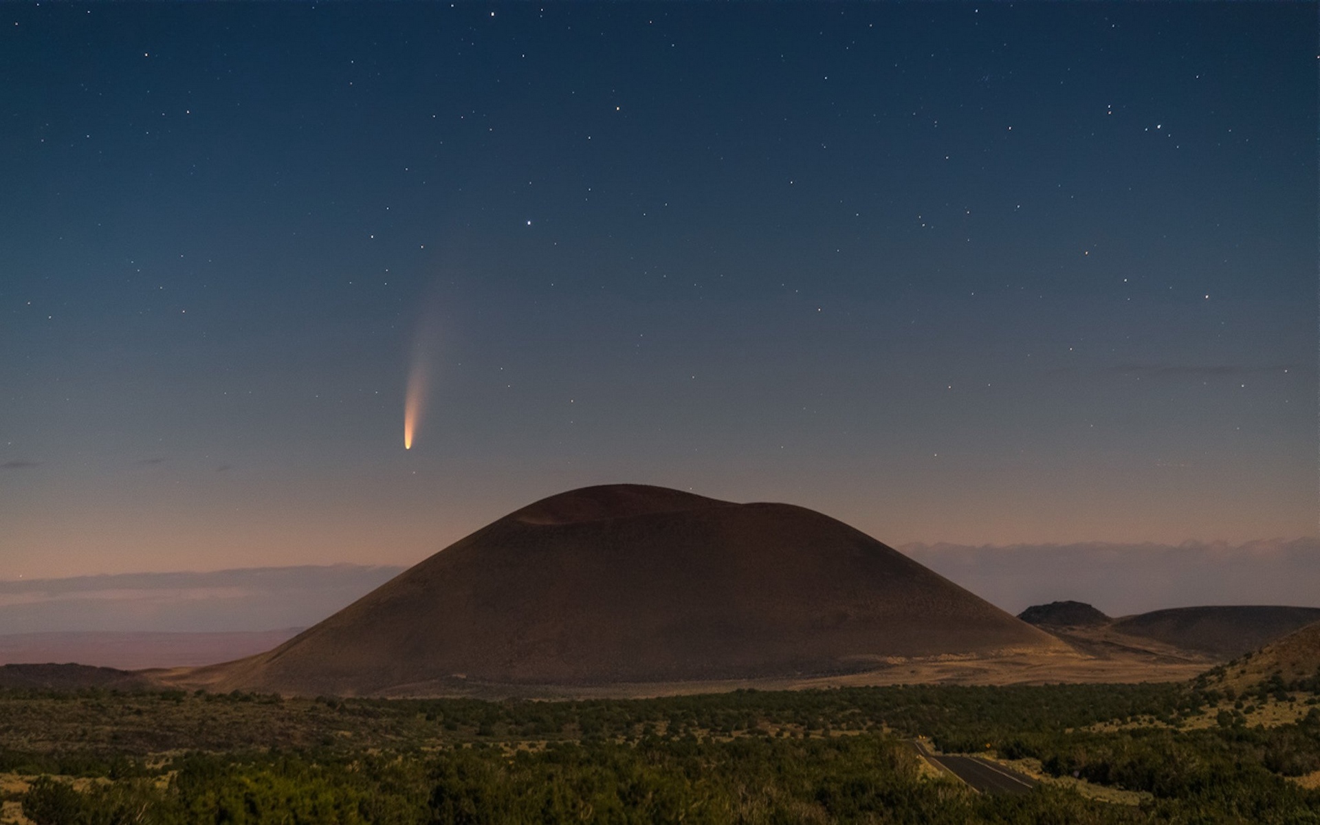 Description: A hill with a sky full of stars and a bright light in the distance above it and a road running through it.