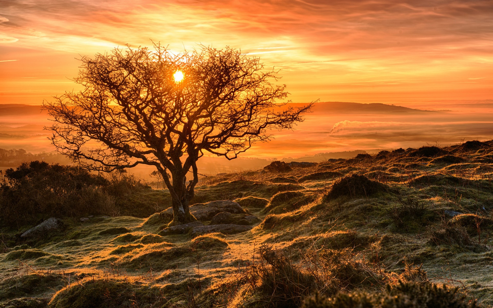 Hill sunset fog tree lake - free wallpaper for desktop | 5desktop.com