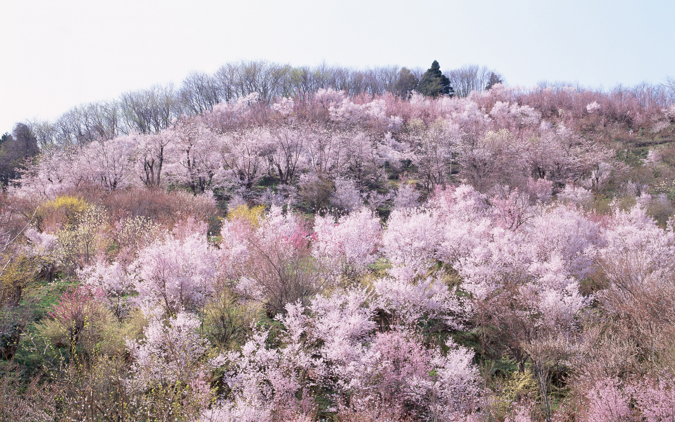 Description: A hillside covered in lots of pink flowers and trees with a forest in the background with a few trees.
