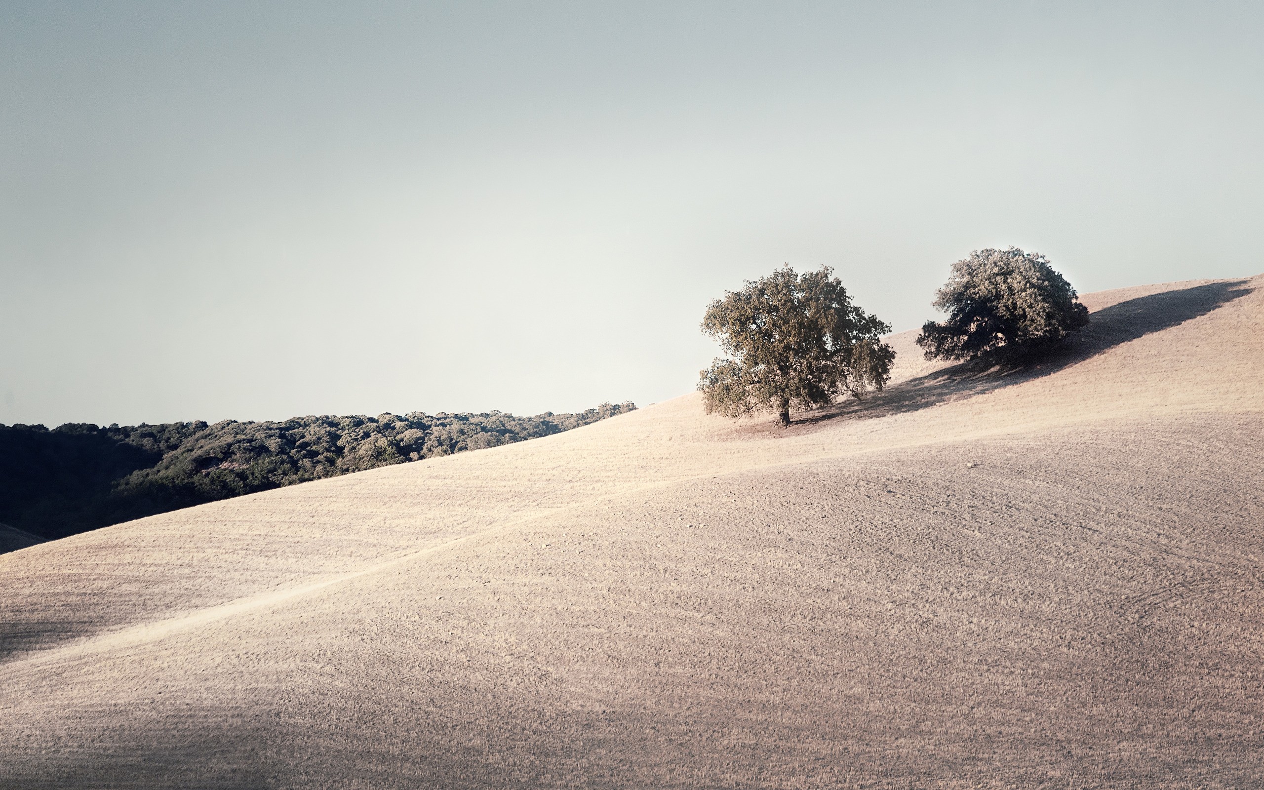 Description: A couple of trees that are in the sand of a hill side area of a hill side area of a hill.