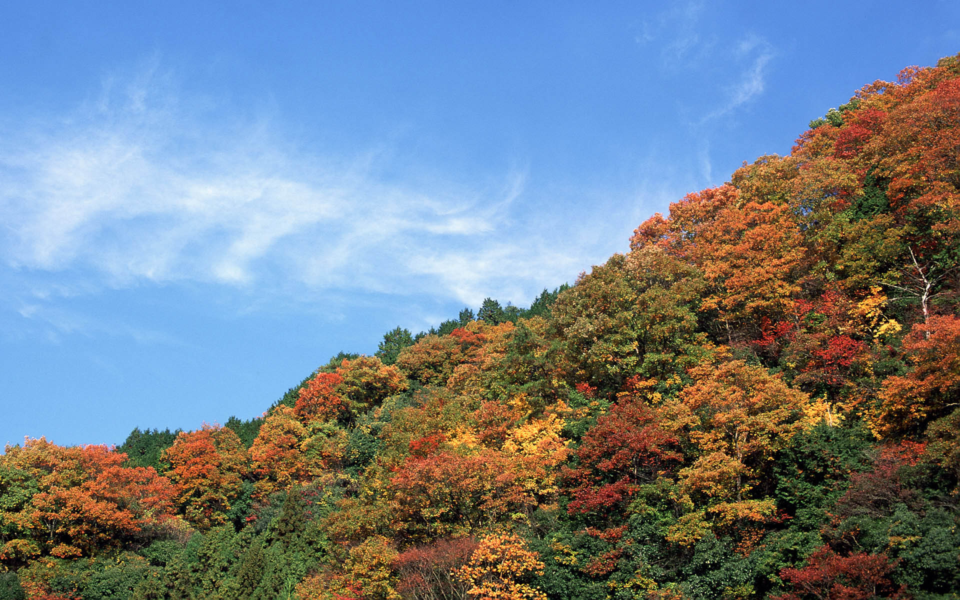 Description: A hillside with trees and a blue sky in the background with clouds in the sky and a few trees with orange and yellow leaves.