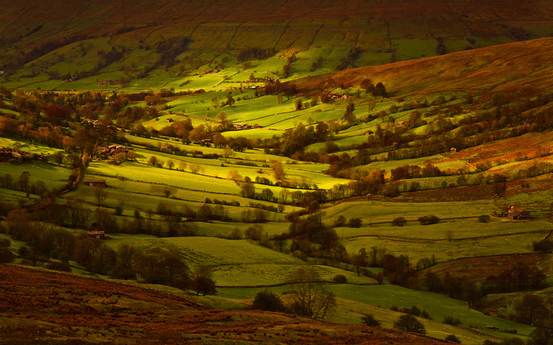 Description: A hillside with a lot of trees and grass on it's sides and a few houses on the hill.