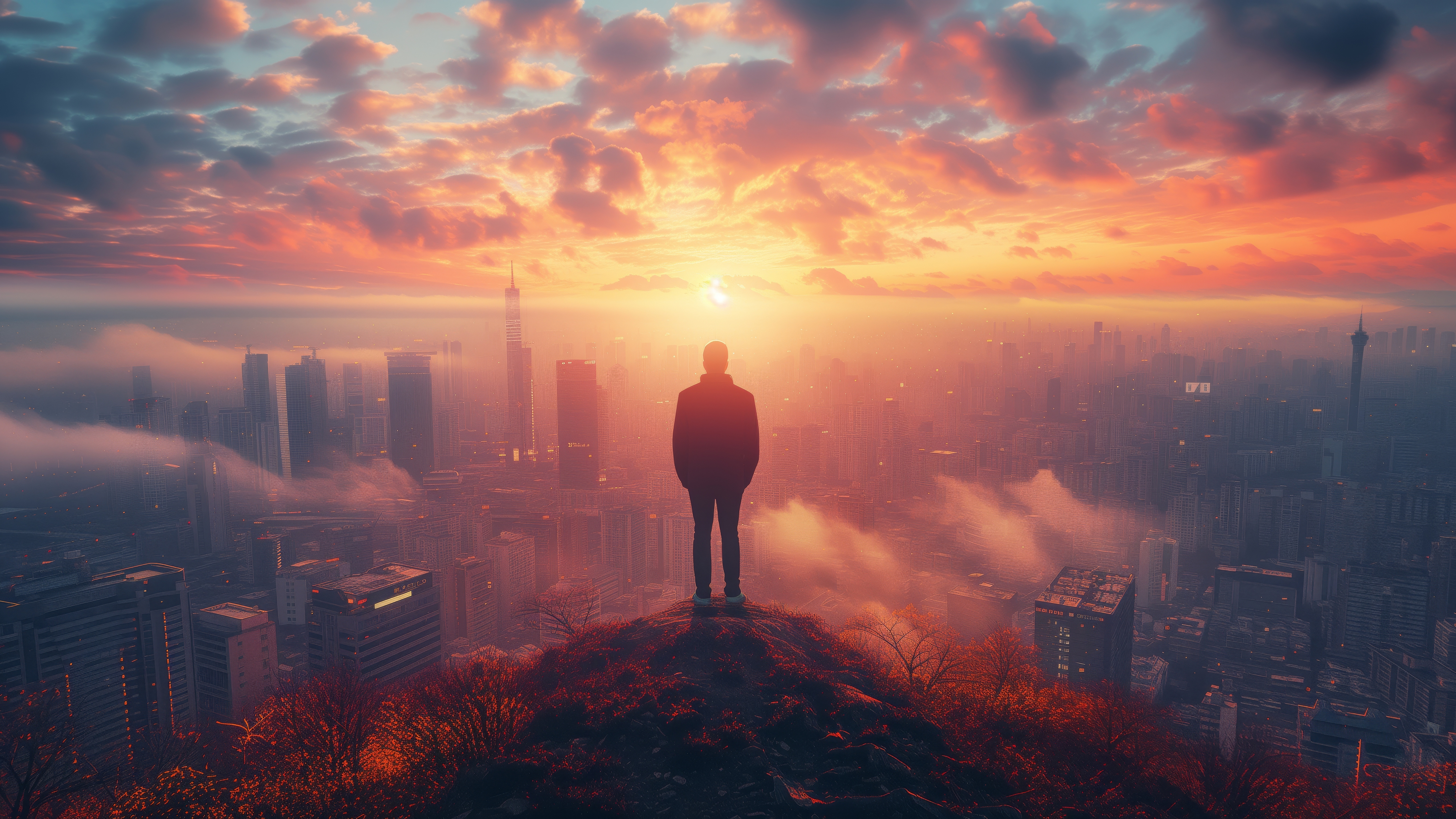 Description: A man standing on top of a hill looking at a city skyline at sunset with clouds and fog in the sky.