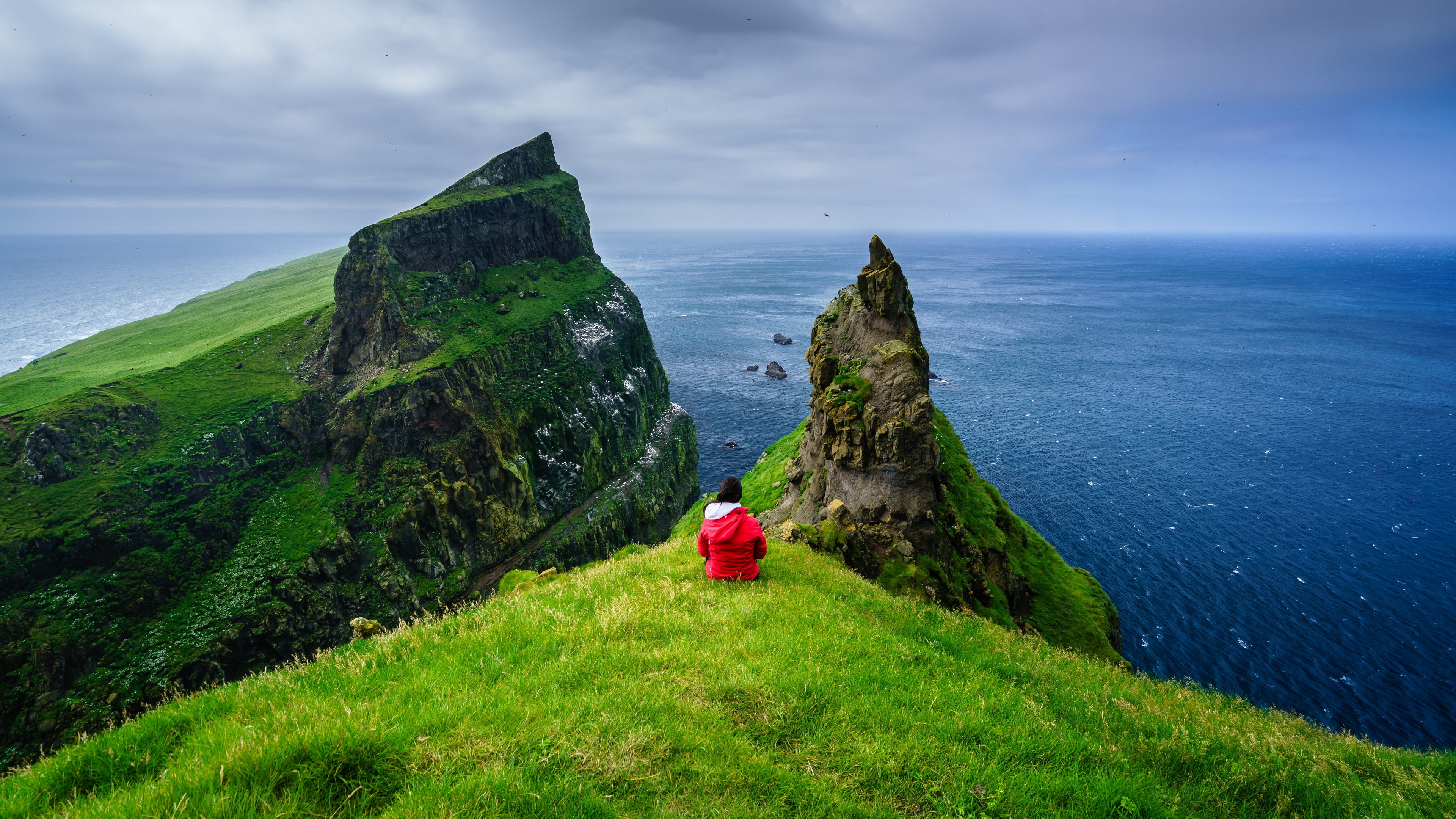 Description: A person sitting on a grassy hill overlooking the ocean and a mountain range with a cliff in the background.