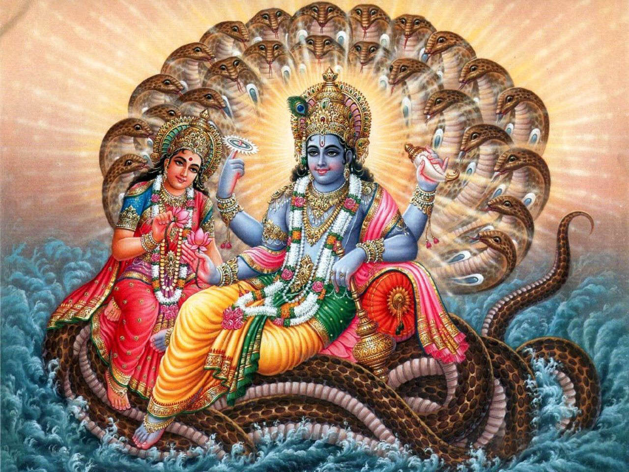 Description: A painting of a hindu god and a demon on a boat in the ocean with a sun above it.