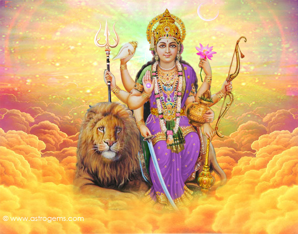 Description: A painting of a hindu god with a lion and a staff of fire in his hand and a crown on his head.