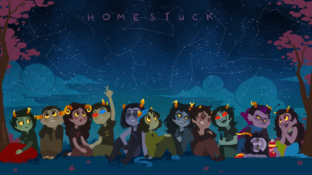 Description: A group of people standing in front of a night sky with stars and trees in the background with the words homesick written above them.