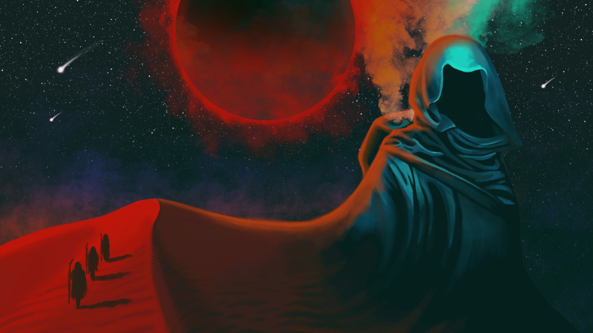 Description: A painting of a person in a hooded cloak standing in front of a red sun and a black and blue sky.