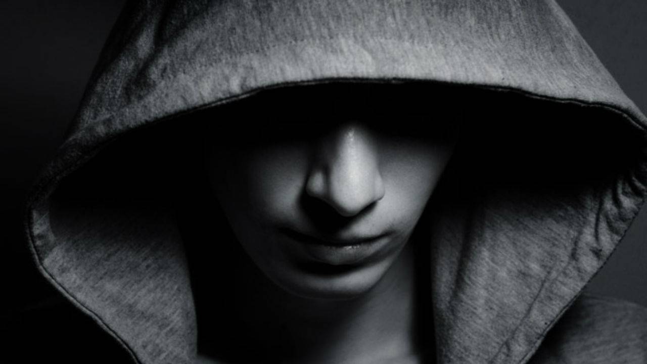 Description: A person with a hood on their head and a cell phone in their hand in front of them.