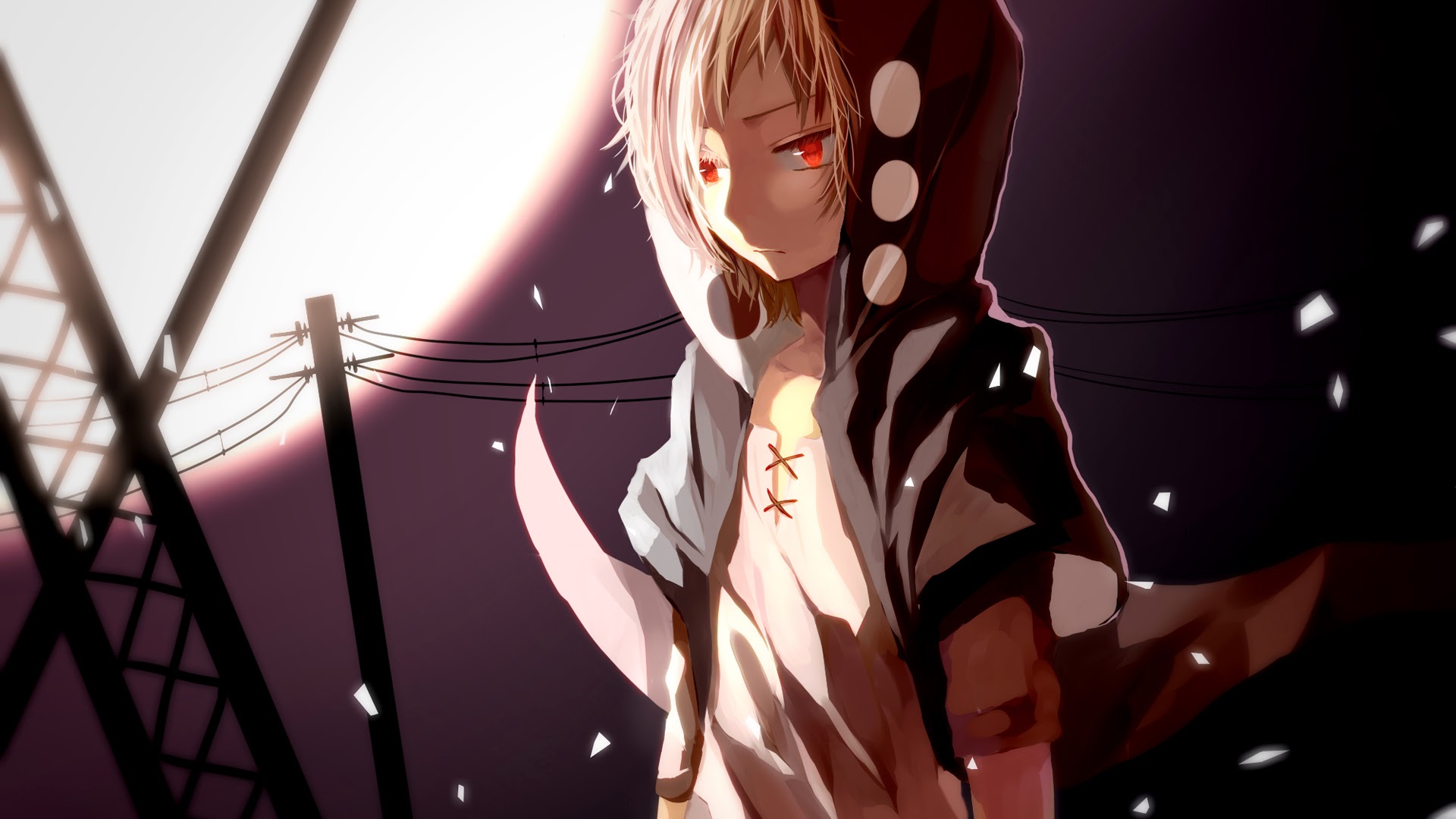 Description: A person with a hoodie on standing in front of a power line and a building with a red eye.