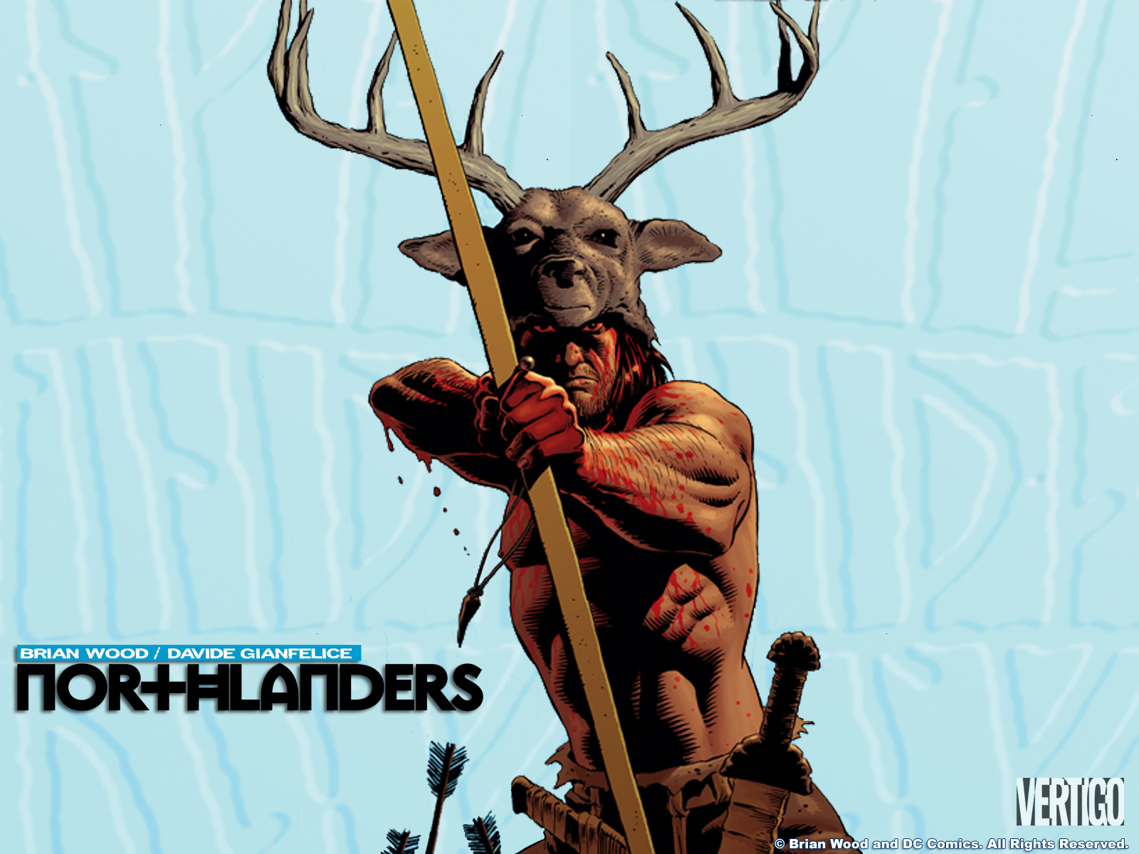 Description: A man with a horned head holding a sword and a deer's head on his back.