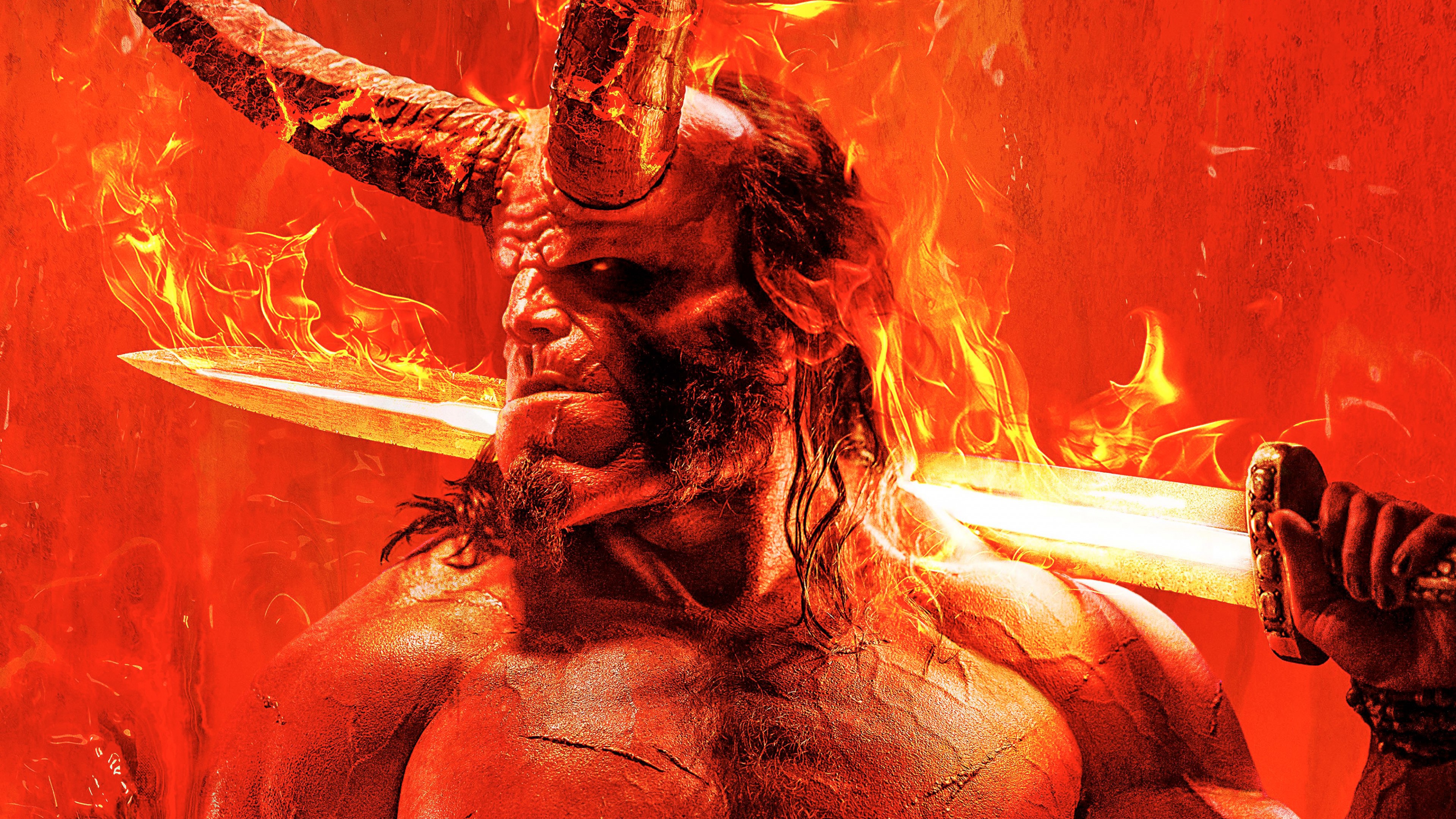 Description: A man with a horned head and a sword in his hand in front of a fire background with flames.
