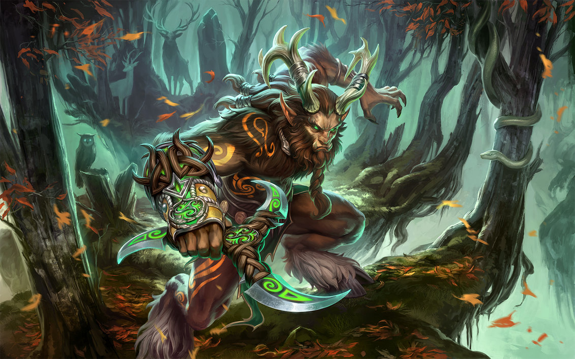 Description: A man with a horned face holding a sword in a forest with leaves and trees around him.