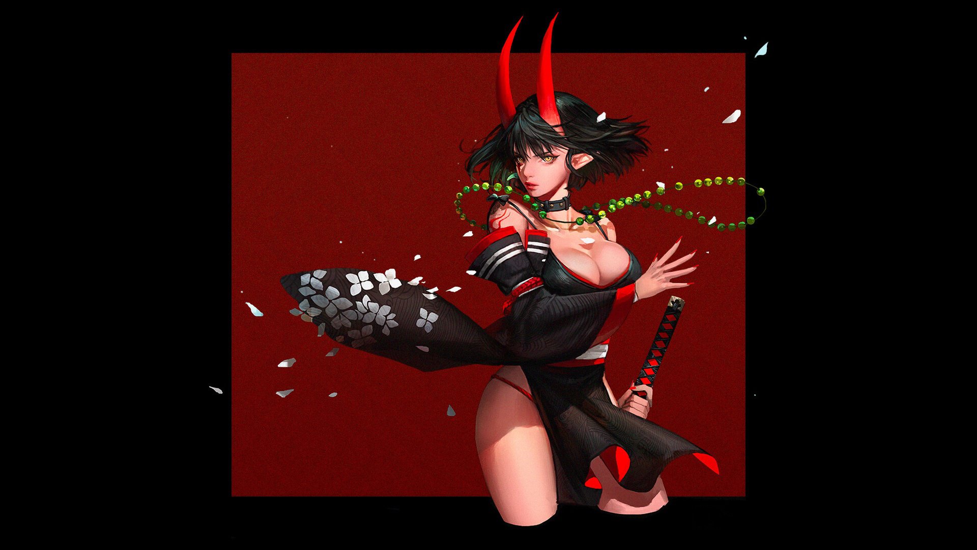Description: A woman dressed in a costume with horns and a sword in her hand.