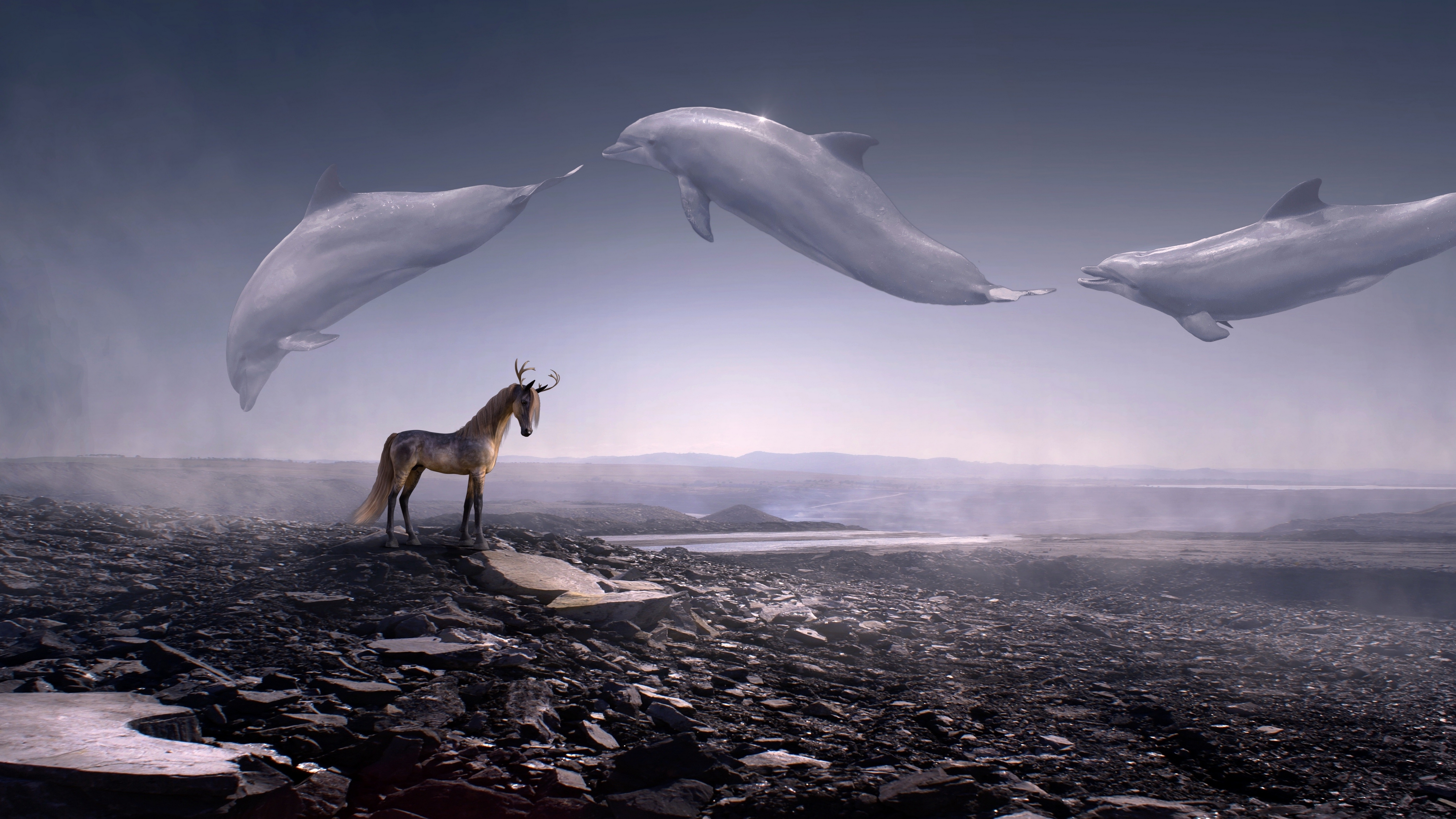Description: A horse and a dolphin are on a rocky beach with a mountain in the background and a stream of water.