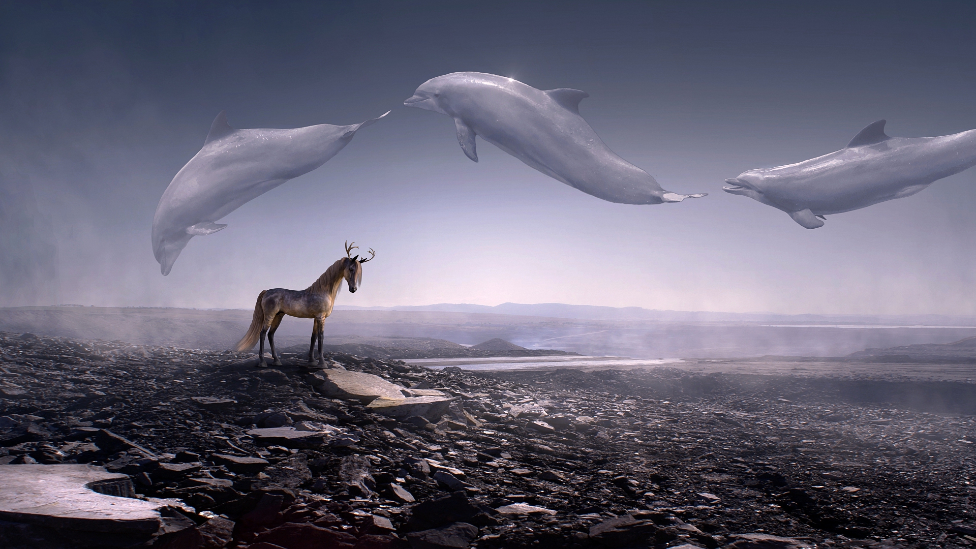 Description: A horse standing on a rocky beach next to two dolphins flying above it and a man standing on a rock.