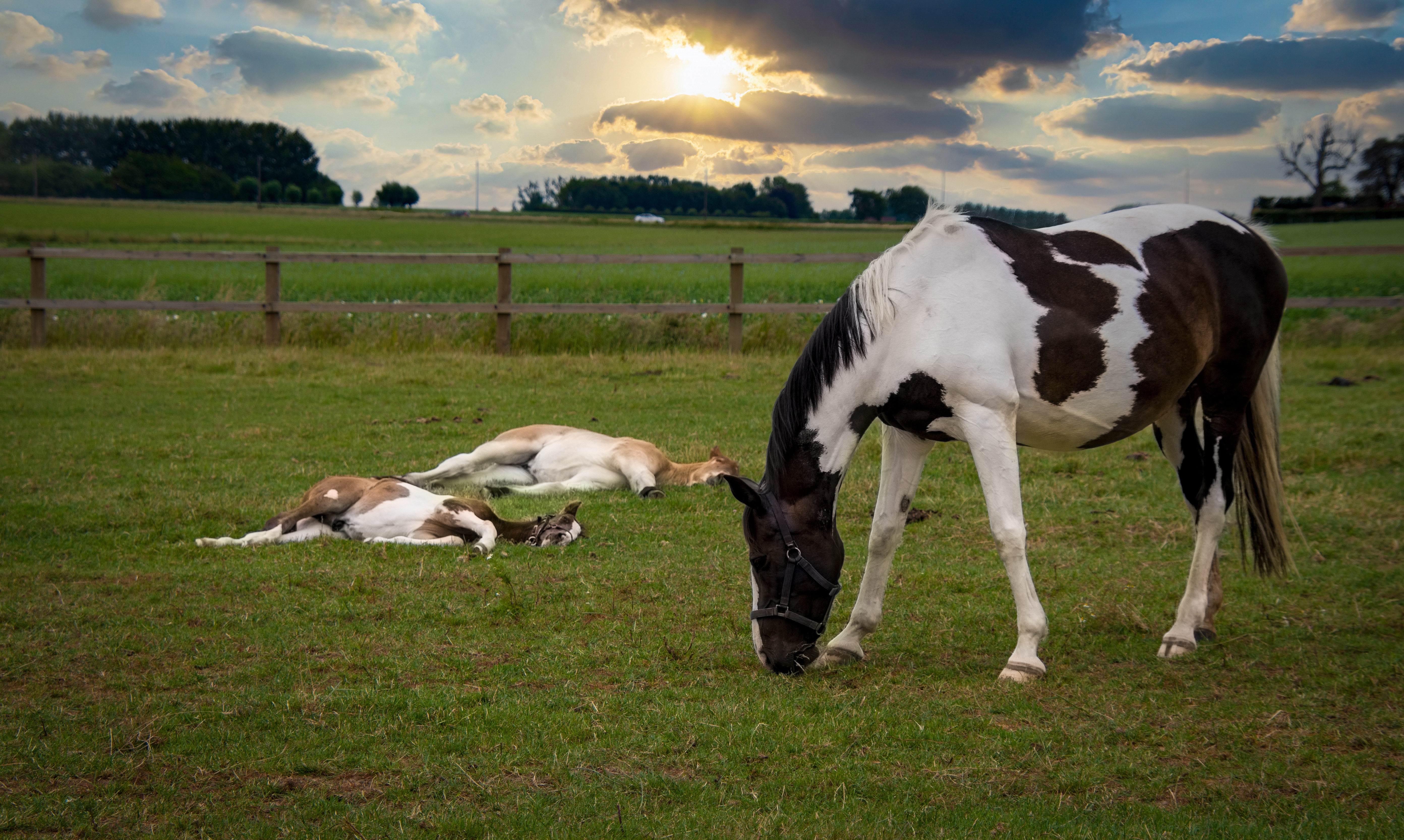 Description: A horse and a foal are grazing in a field with a fence in the background and a sun setting.
