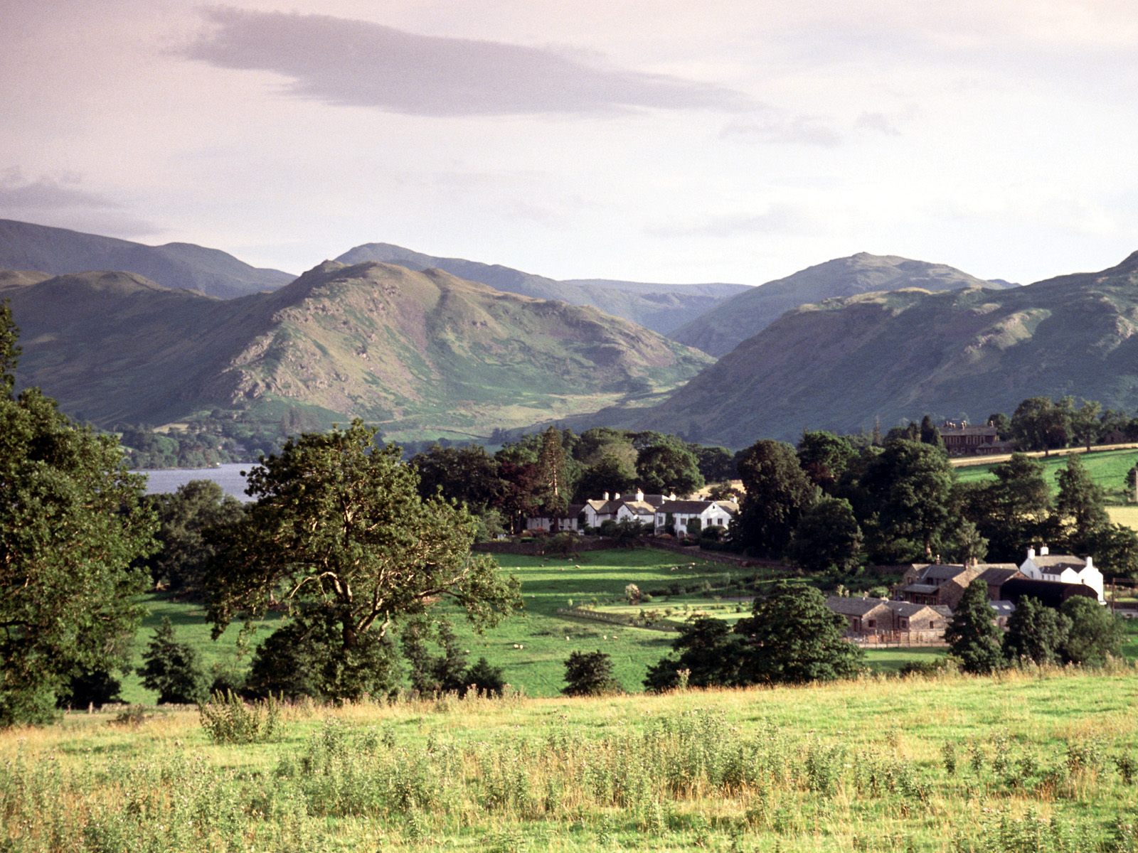 Description: A horse grazing in a field with mountains in the background and a lake in the foreground with houses in the foreground.