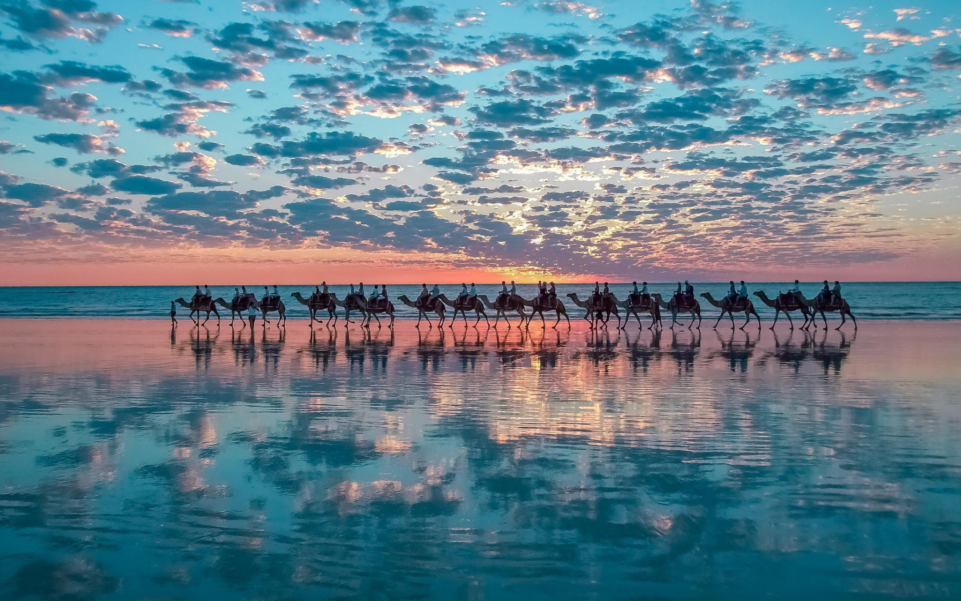 Description: A group of people riding horses across a body of water at sunset or dawn on a beach with a few clouds.
