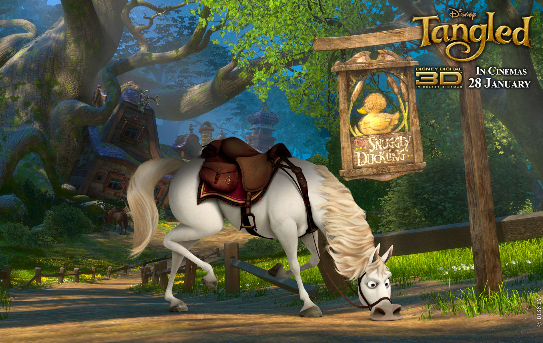 Description: A horse with a saddle is walking in front of a sign that says tangled 3d cinema and animation studio.