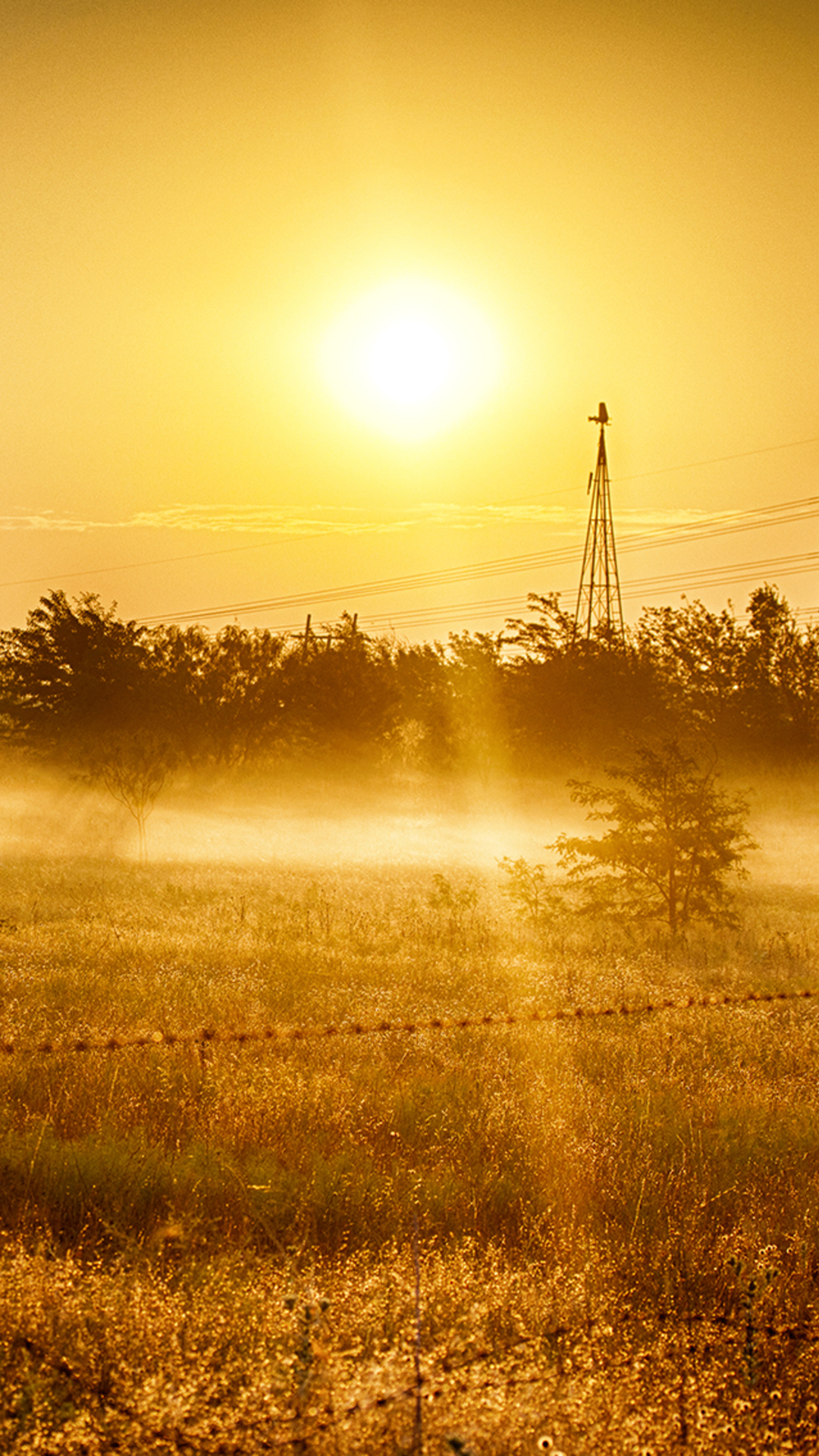 Description: A horse standing in a field with the sun setting in the background and fog in the air behind it.